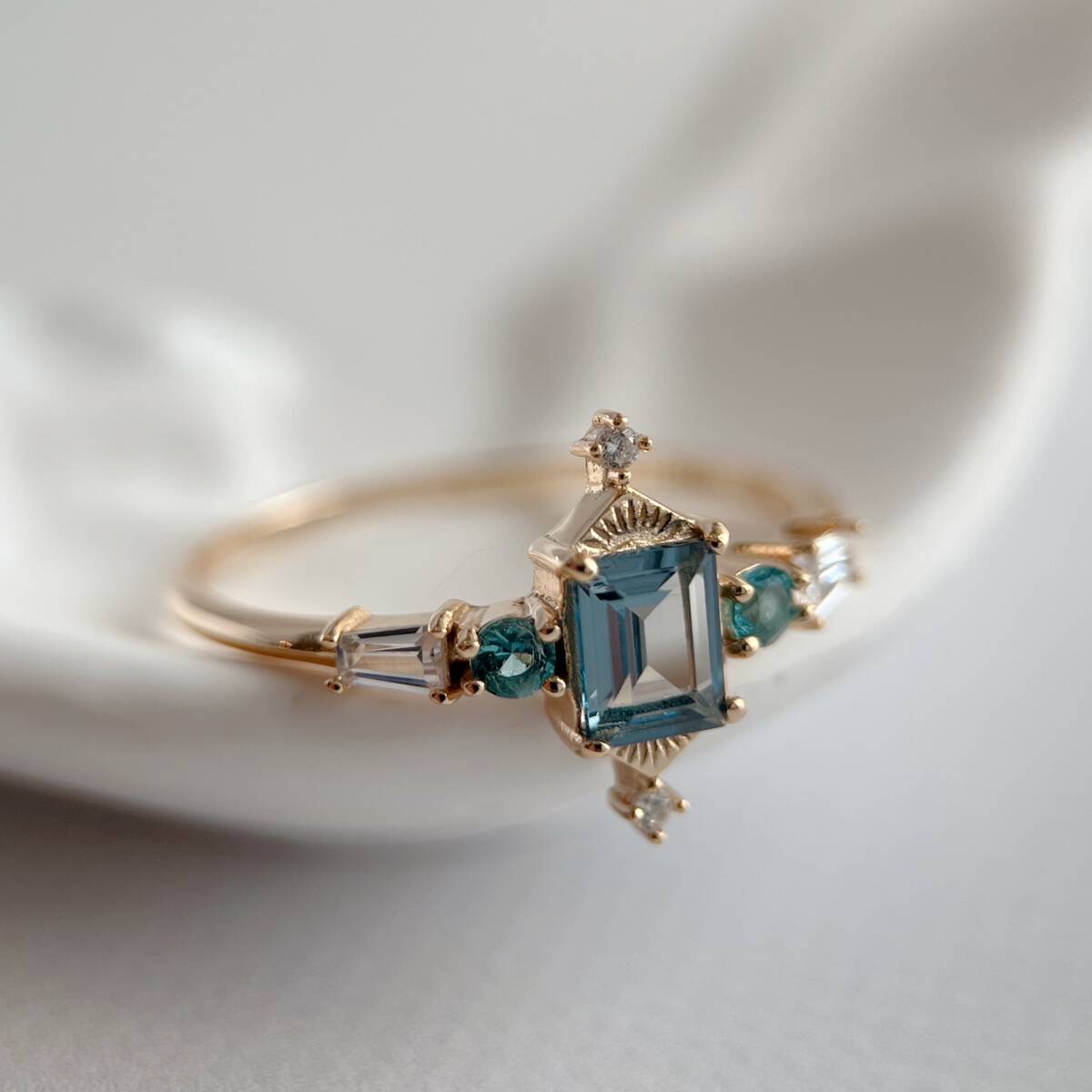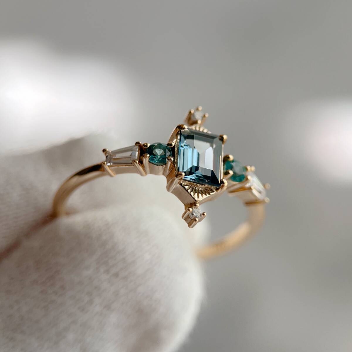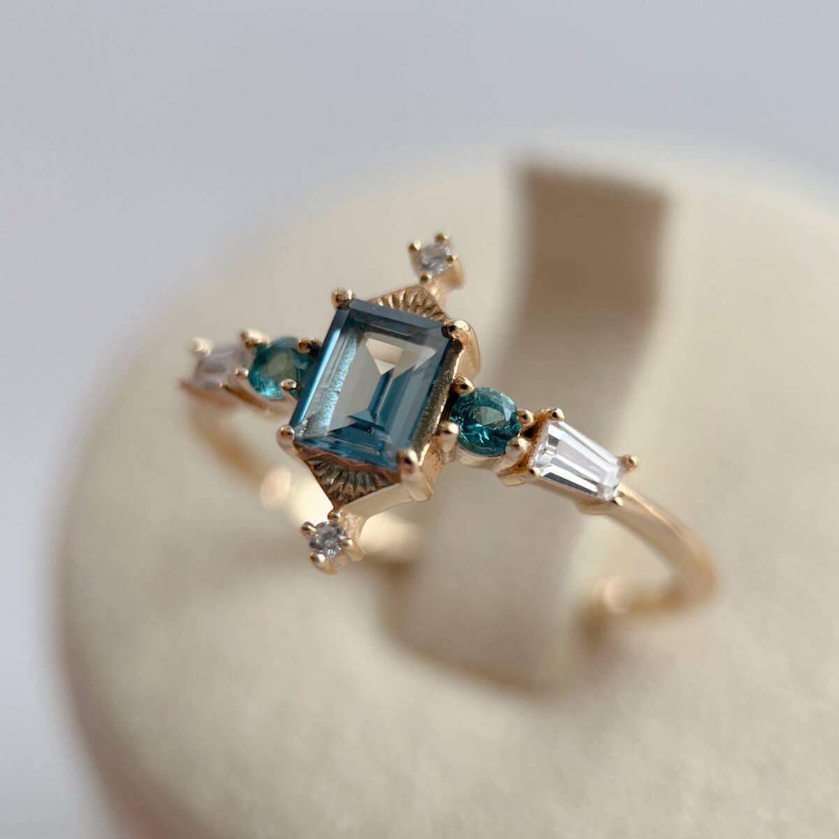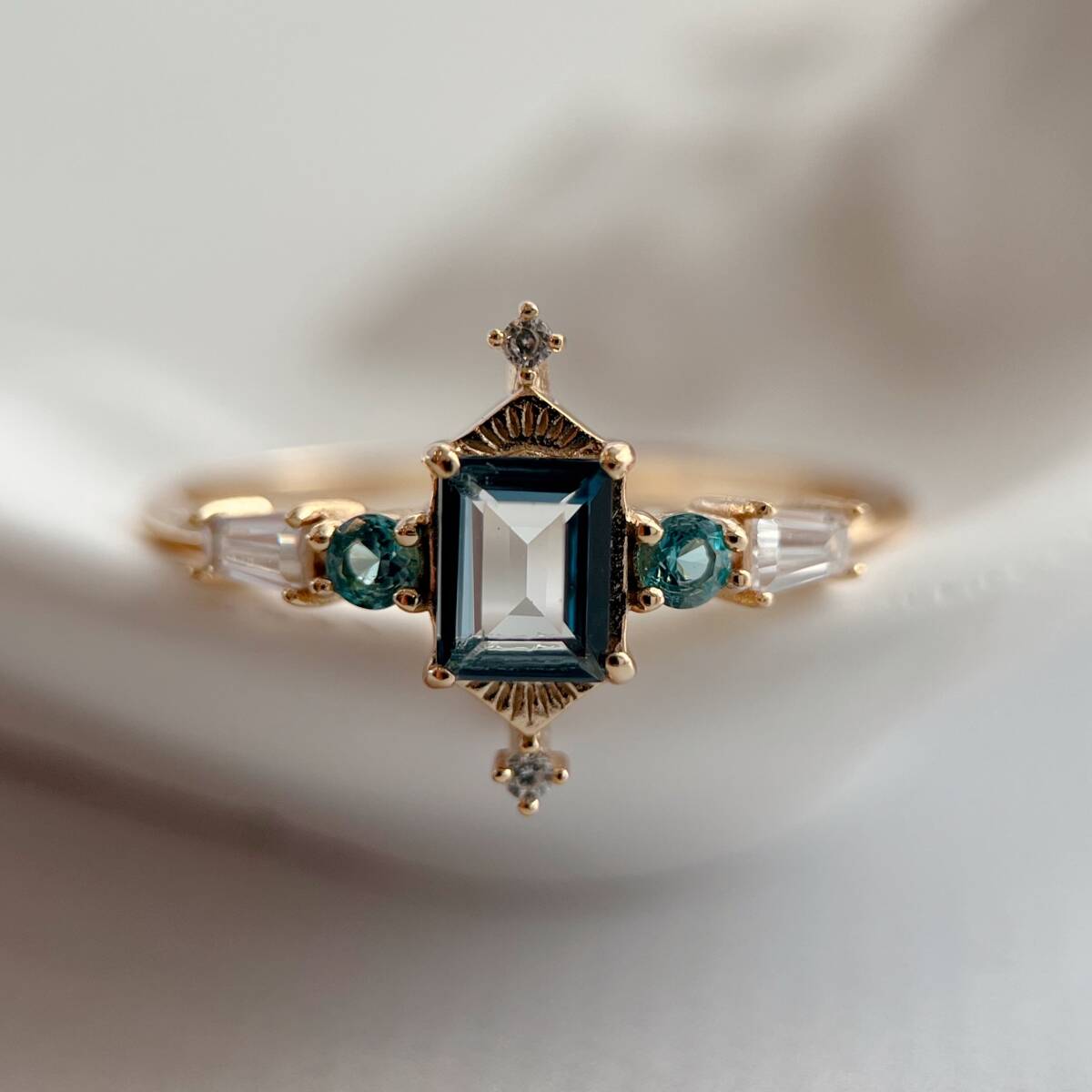 レクタングルカットの天然ロンドンブルートパーズのリング。