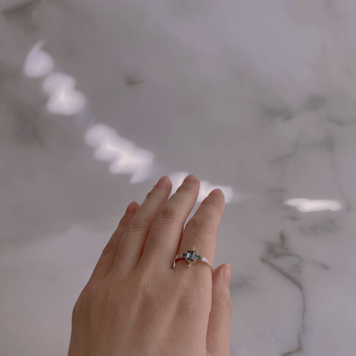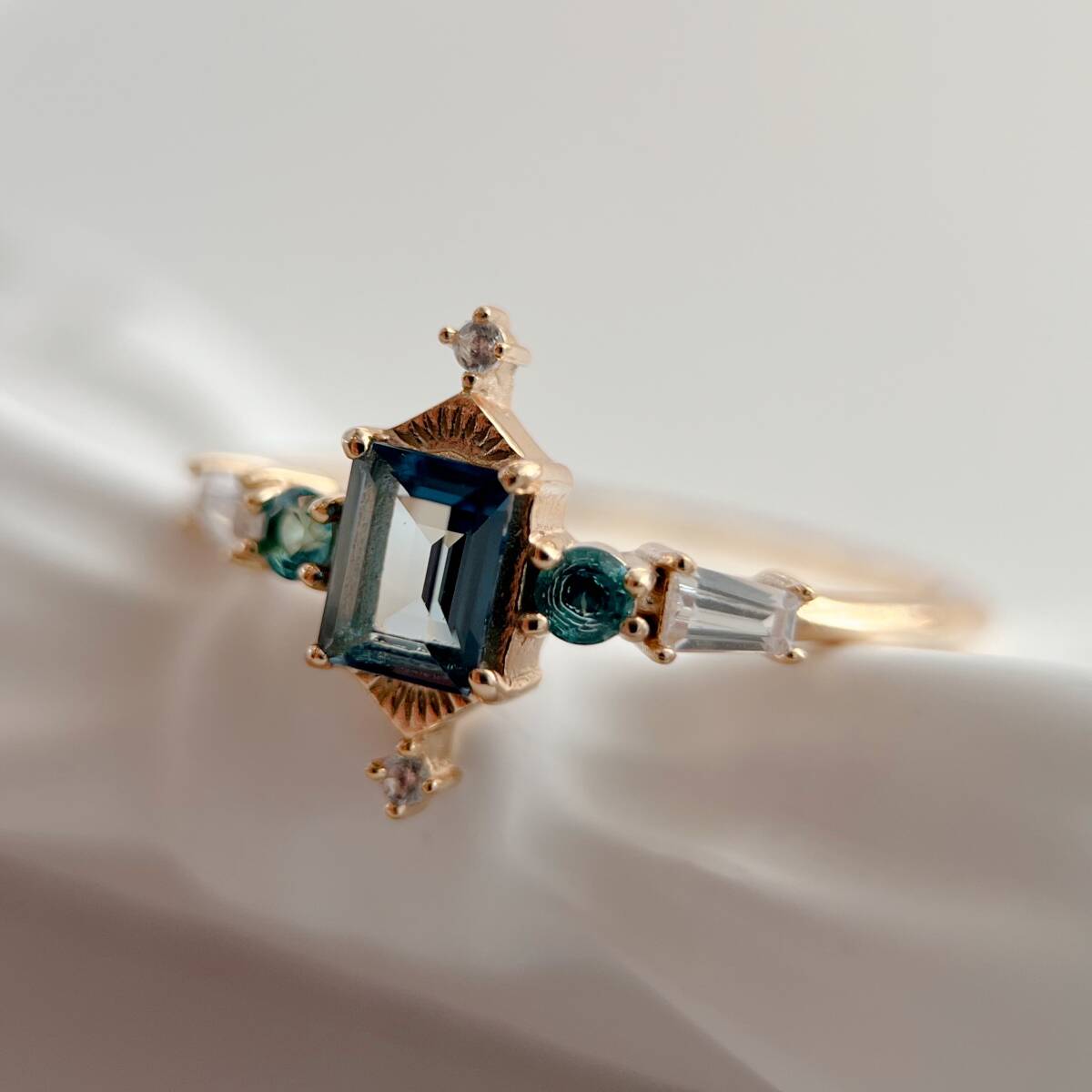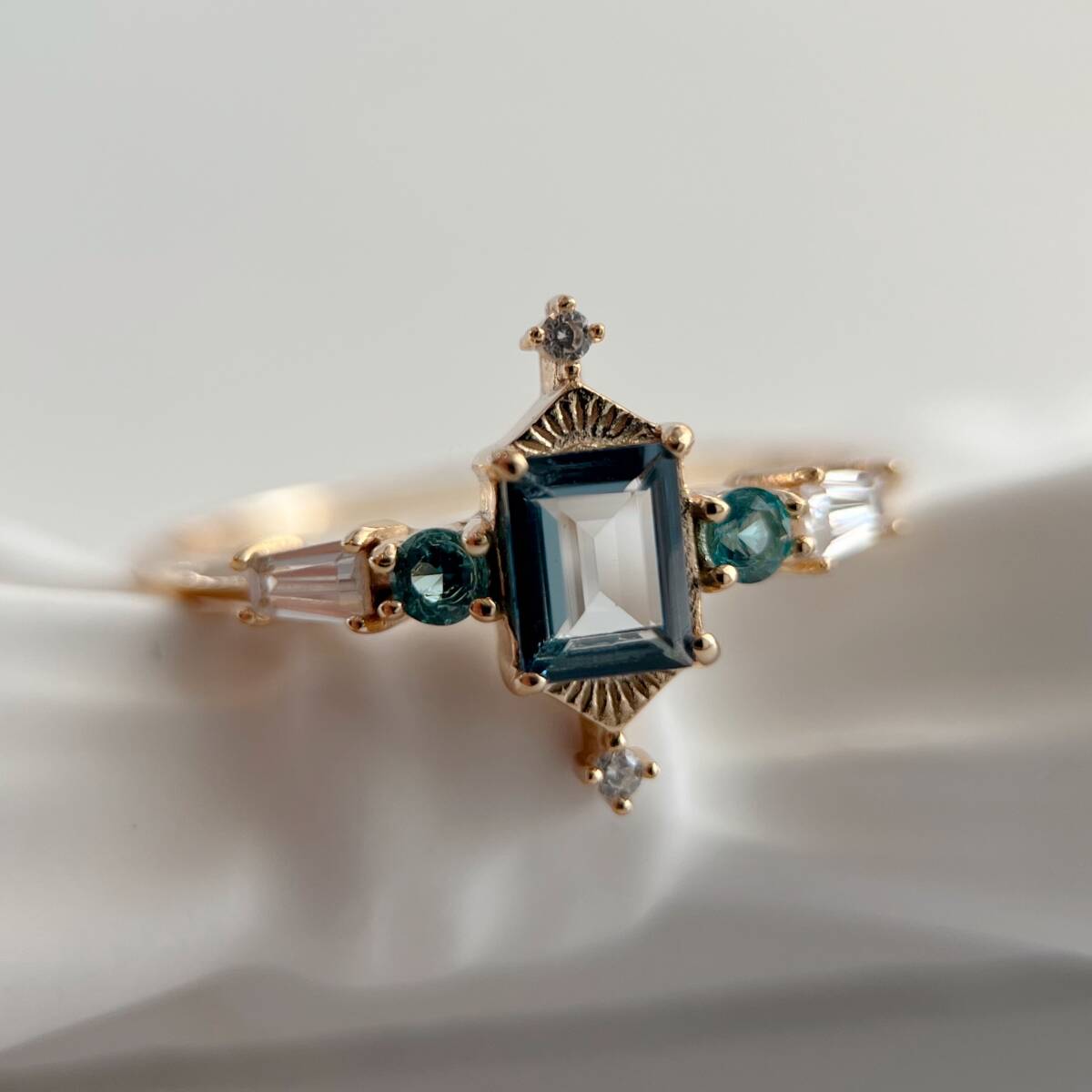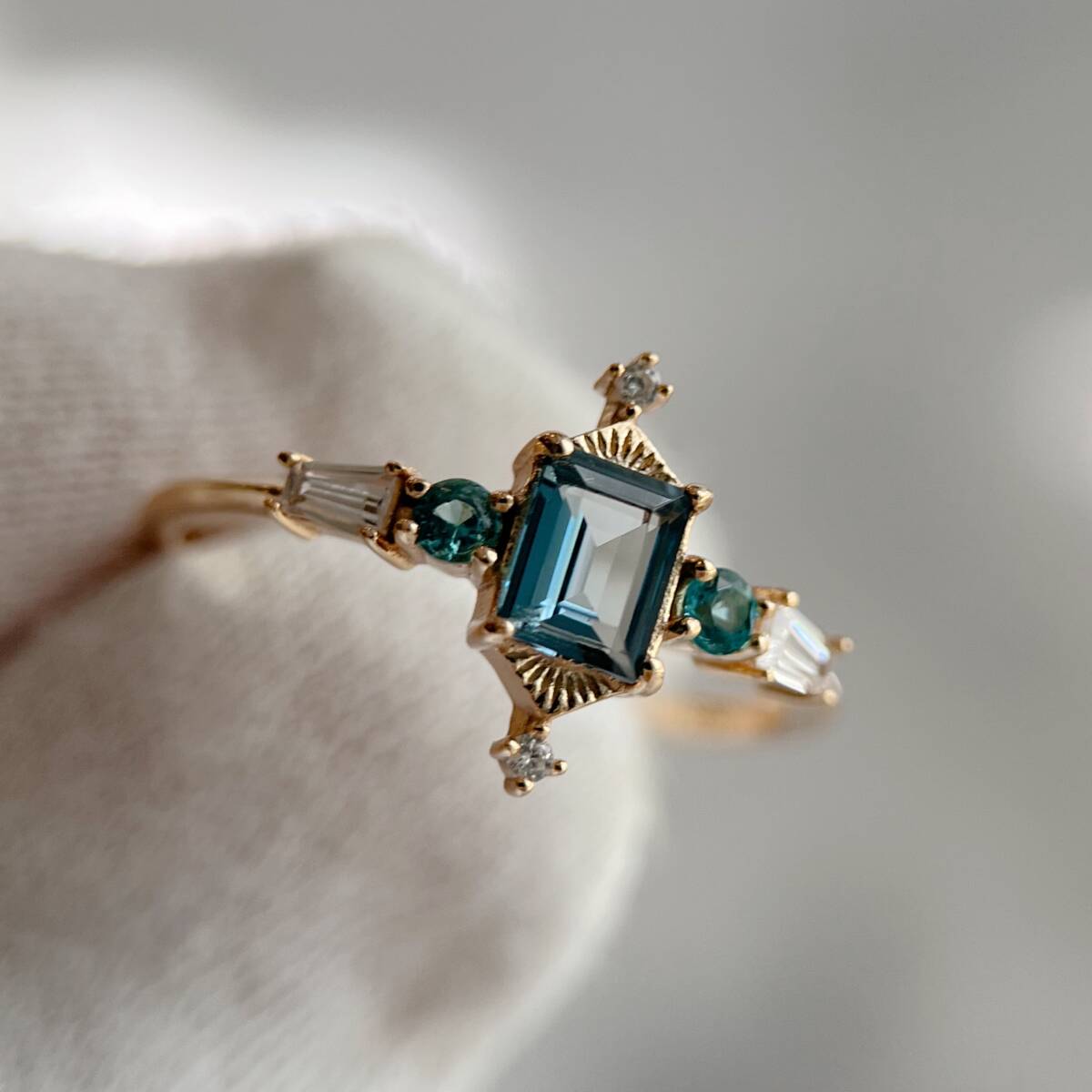 レクタングルカットの天然ロンドンブルートパーズのリング。