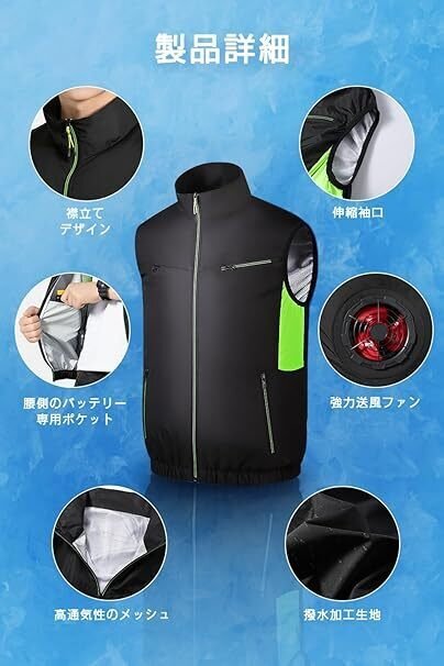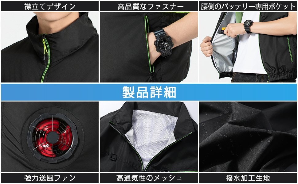 【撥水加工&3D循環送風】作業服 ベストは通気性が良く、UVカット機能も高いポリエステル素材を使用し、汗をかいてもすぐに乾きます。直立ネックラインデザインで3D換気効果を高め、首の周りの風を実現するのに役立ちます。二つファンを腰の両サイドに設置され、強力な風力で冷却ベスト内部で空気の循環を生み出し、人体から発散する熱を素早く吹き飛ばすことができます。摩耗に強く、また撥水加工もより強く施され、疲労軽減と不快軽減などにも効果が期待されます。