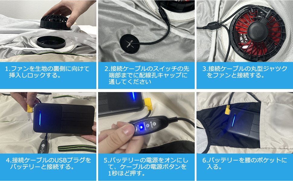 【超大風量&3段階風量調節】作業服のファンは3枚の大面積羽根を採用して、風がより強くなるので快適に過ごせます。接続ケーブルで「強風」「中風」「弱風」の3段階風量を調整できます。付属のバッテリーの出力はUSBコネクタ(5V出力)で、付属のバッテリーだけでなく、別のUSB出力モバイルバッテリーもファンと接続してから使用可能です。尚、このファンは7.4v出力のバッテリーも対応でき、より大きなパワーを送ることができます。
