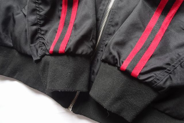 肩から袖にかけて、赤・黒・赤のラインテープ生地貼付け縫いです。