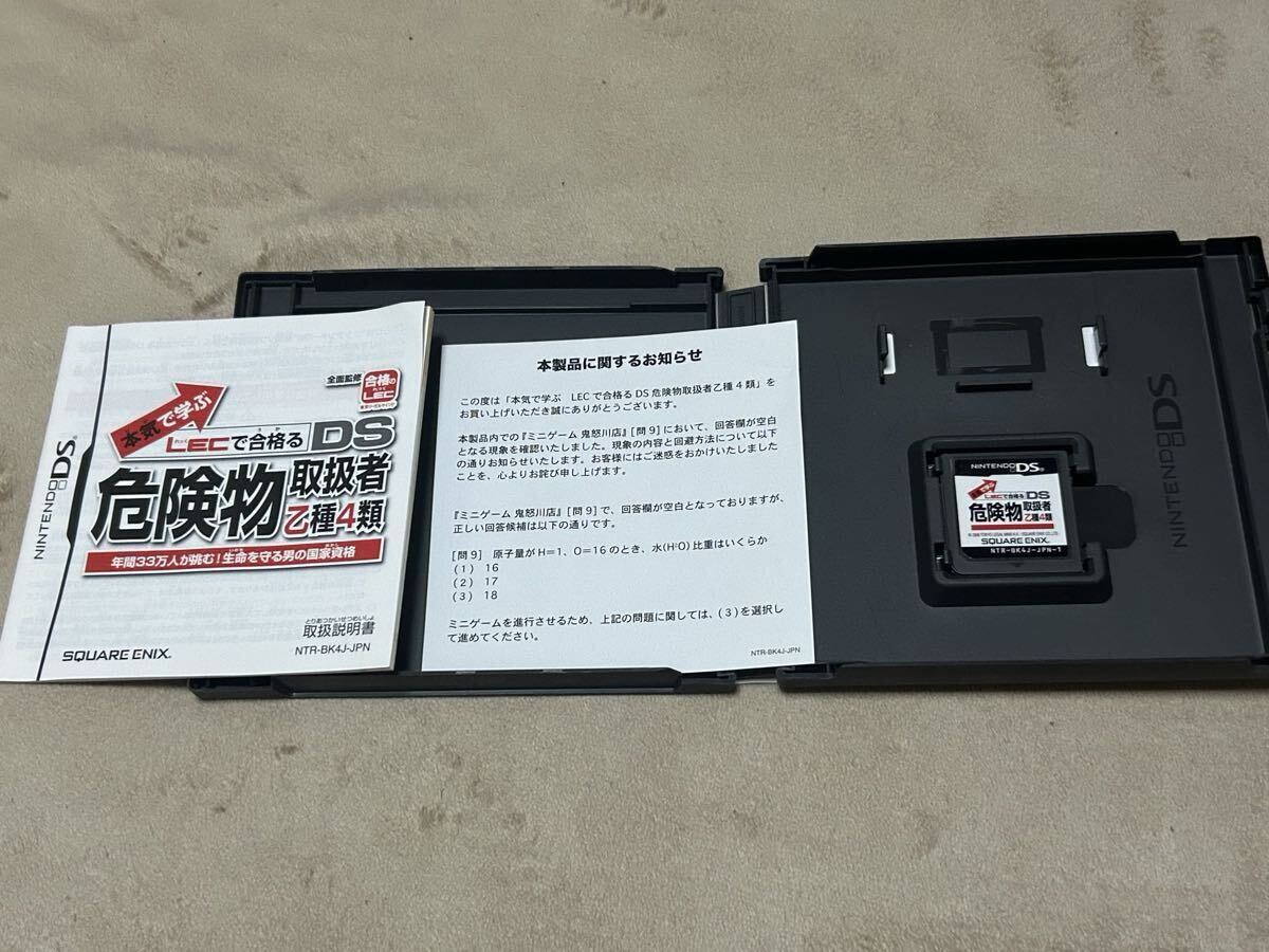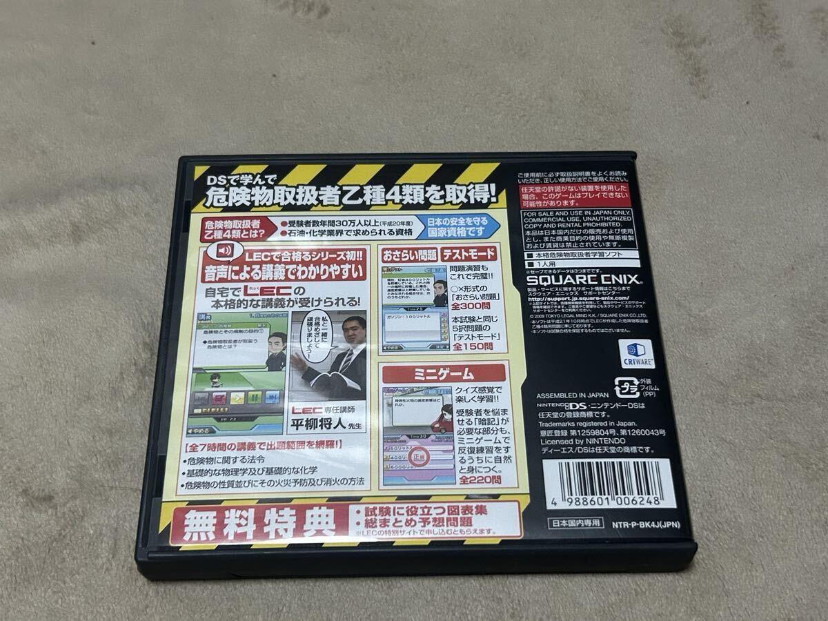 ニンテンドーDSのソフト「危険物取扱者 乙種4類」です。 LECの講義をフルボイスで再現したソフトで、危険物取扱者の資格取得を目指せます。