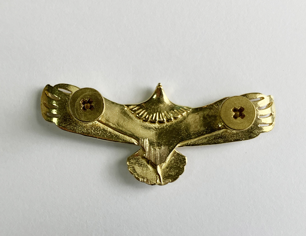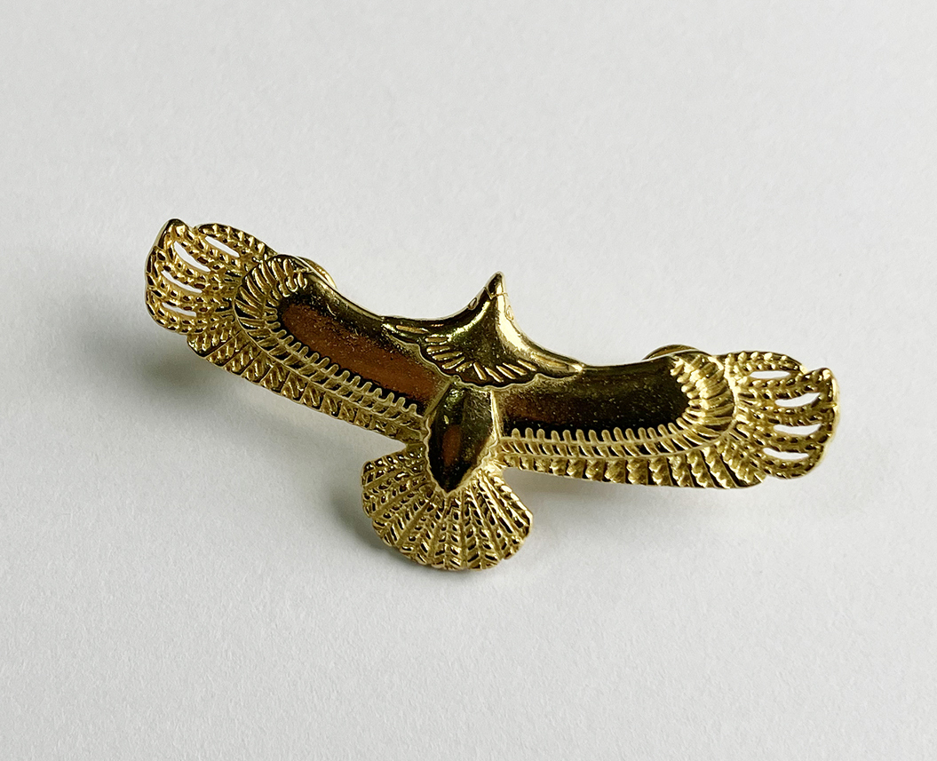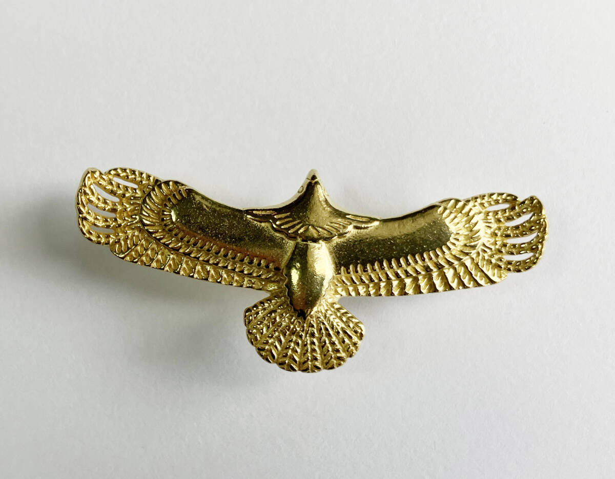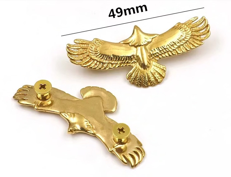 当方の出品商品をご覧頂き、誠にありがとうございます。 ■イーグル(鷲[ワシ])をモチーフにしたコンチョ。羽を広げた鷲が迫力あるデザインとなっています。 ■財布やカバンなどのリメイク・ドレスアップにオススメです。 ■裏面にネジが付属しているので、ドライバー等で簡単に付け外しが可能。 ■素材には五円玉にも使われている真鍮を使用。真鍮は別名「黄銅」「ブラス(Brass)」とも呼ばれ、銅と亜鉛の合金の素材のことを指します。 ■色:金色 ■サイズ 横:4.9cm×2.1cm |