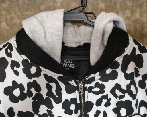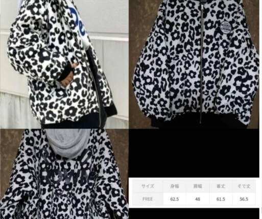 このジャケットは白と黒のヒョウ柄が特徴で、カジュアルなスタイルにぴったりです。フード付きで、ジッパー式のデザインが機能的です。