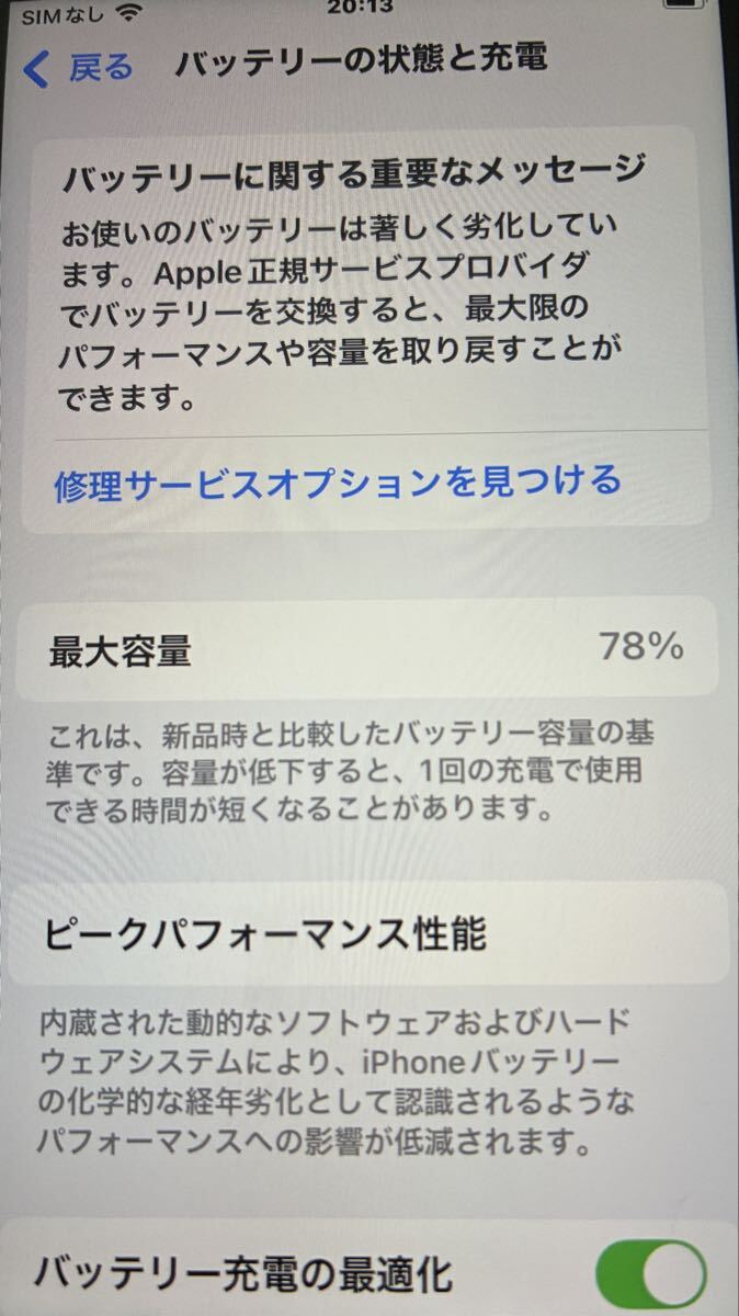 バッテリーの劣化が御座います。最大容量78% 写真参照