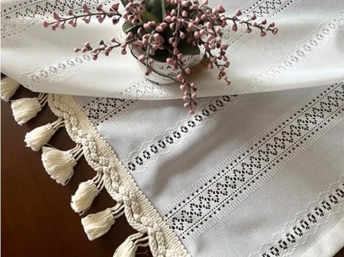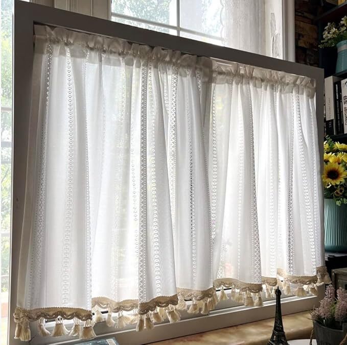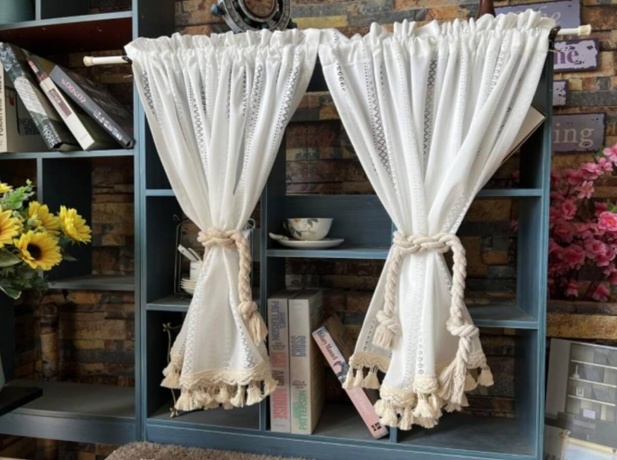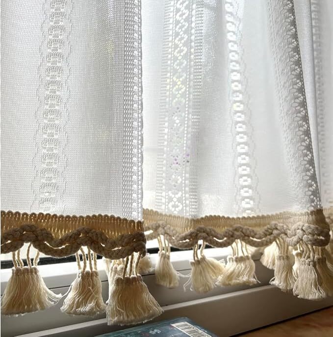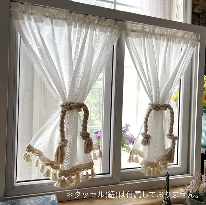 裾の飾りがお洒落なカフェカーテン。(タッセルの付属はありません。)