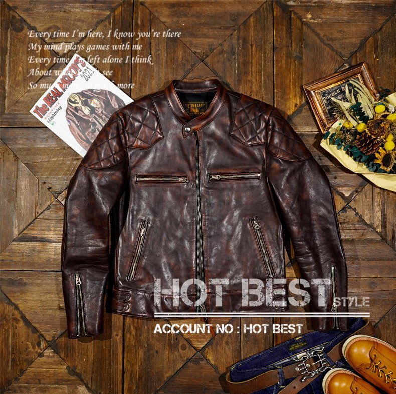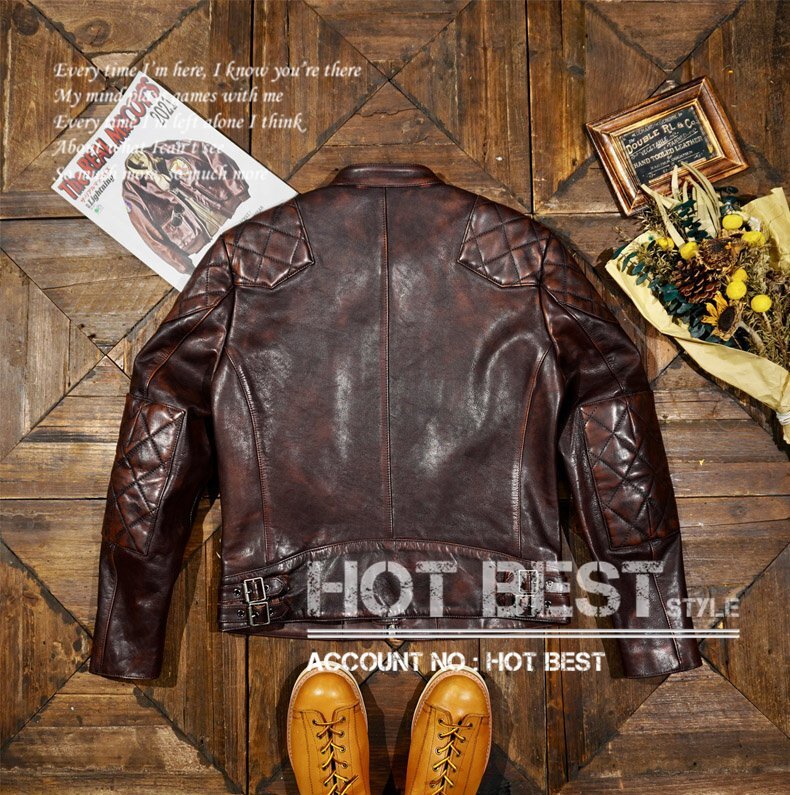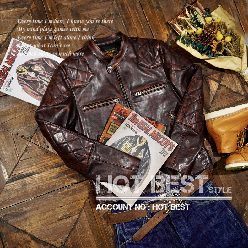 クラシックな50年代スタイルを再現した 茶芯カウハイド パテッド シングルライダースジャケット。ヴィンテージの雰囲気を漂わせながらも、現代のシルエットにアップデートされた一着です。