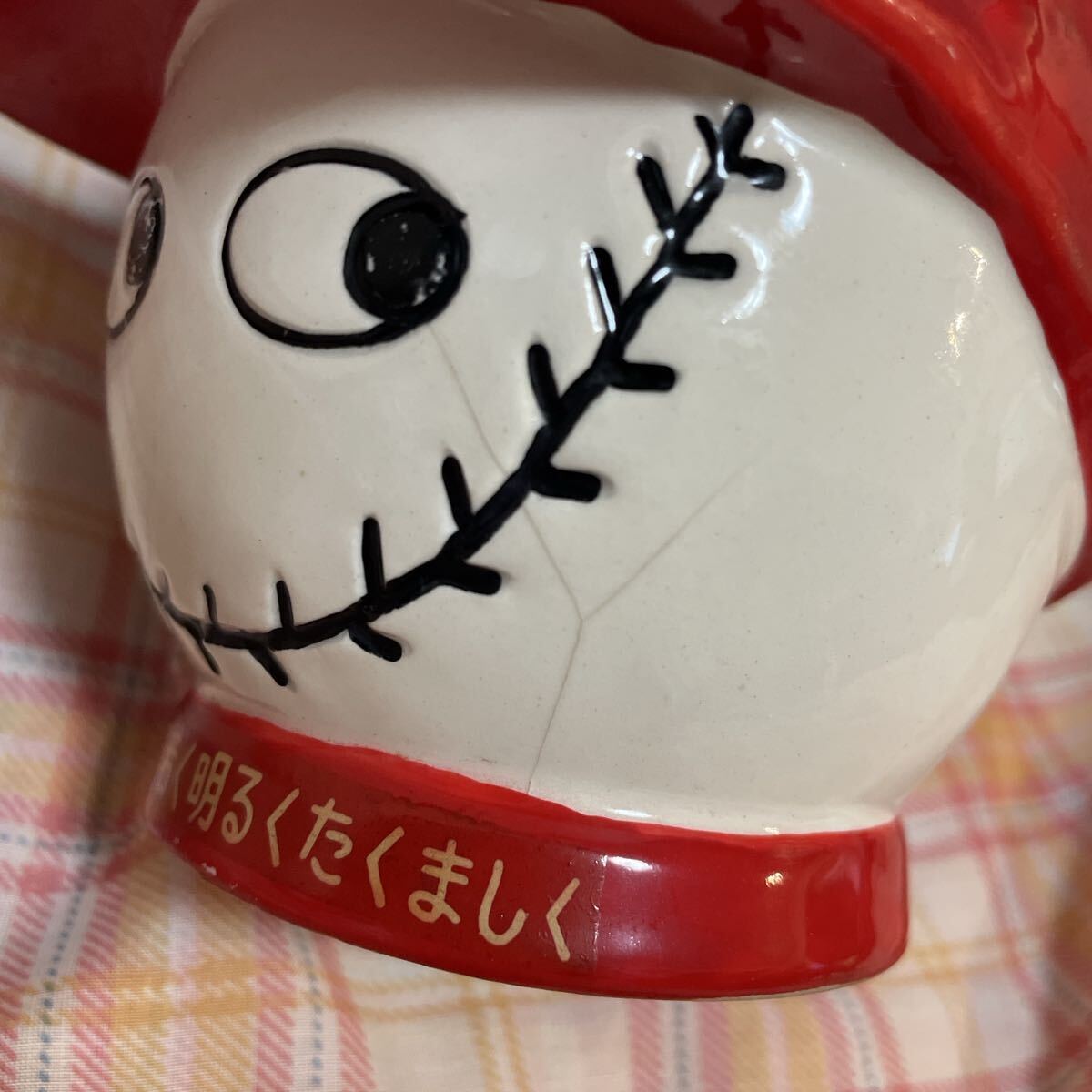 左頬にヒビ割れありますが、引っ掛かりはありませんので塗装割れ?かなと思いますが、壊れる事はなさそうです。