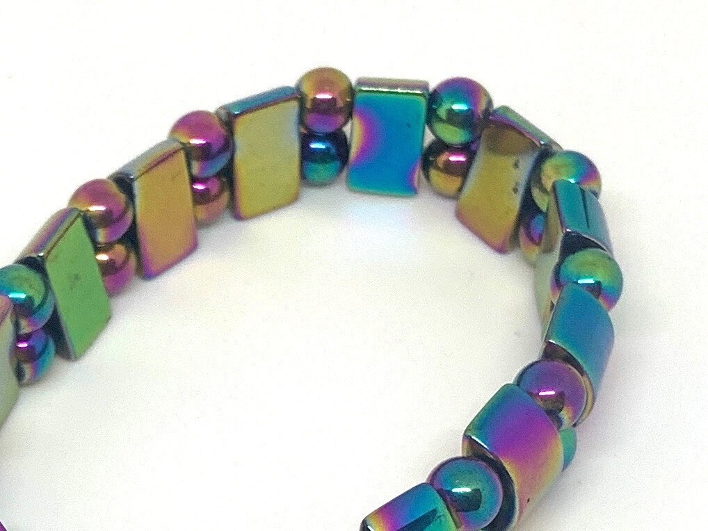 とてもカラフルなヘマタイト磁気ブレスレット レインボーカラーのご案内です。 磁気ヘマタイトは身に着ける人の血液にエネルギーを与えるとされています。 赤血球の働きを活性化し、全身への酸素供給量が高める事から、 運動能力を高める効果や肉体労働をされている方には特におすすめで 持久力を高めると言われています。(薬事効果を保証するものではありません) コーティングは ありますが、ヘマタイトは鉄分を含むため、汗や流水はお避け下さい。 汚れは乾いた柔らかい布で軽く落としてください。手首周囲 17.5センチまでの方に