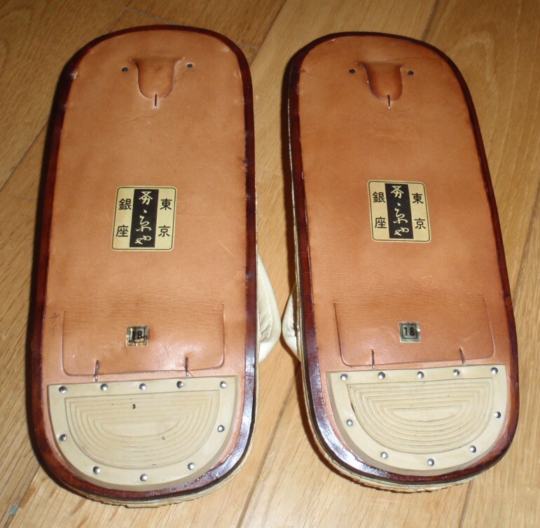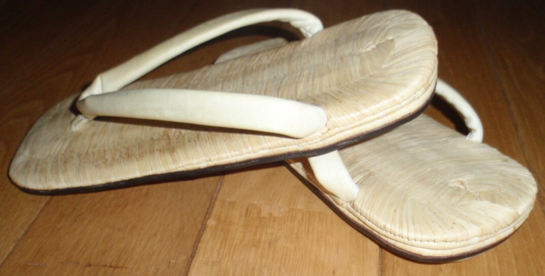 表は本畳表で、鼻緒は牛皮調のアイボリー系、底面は踵3枚重ね、赤牛革底、踵プロテクター付きの丈夫な作りです。
