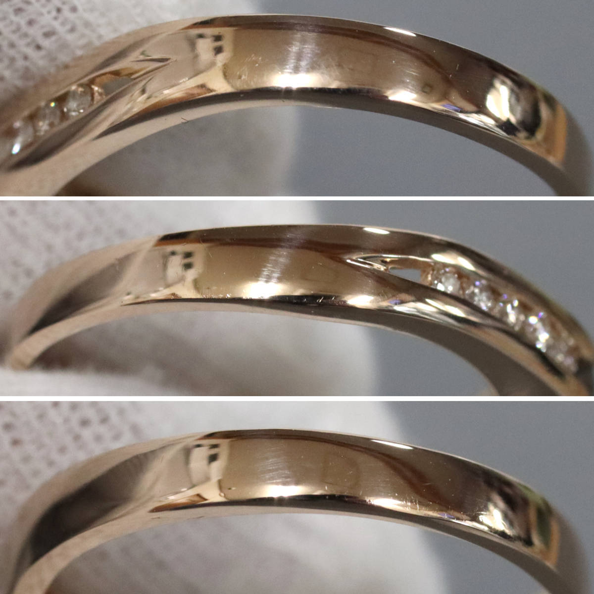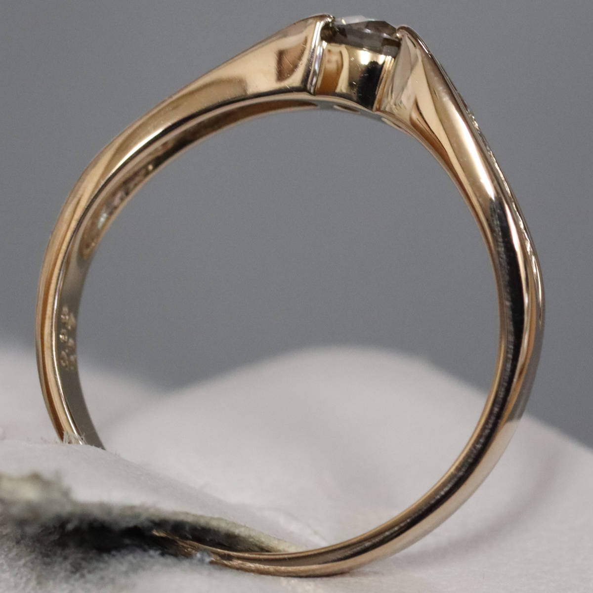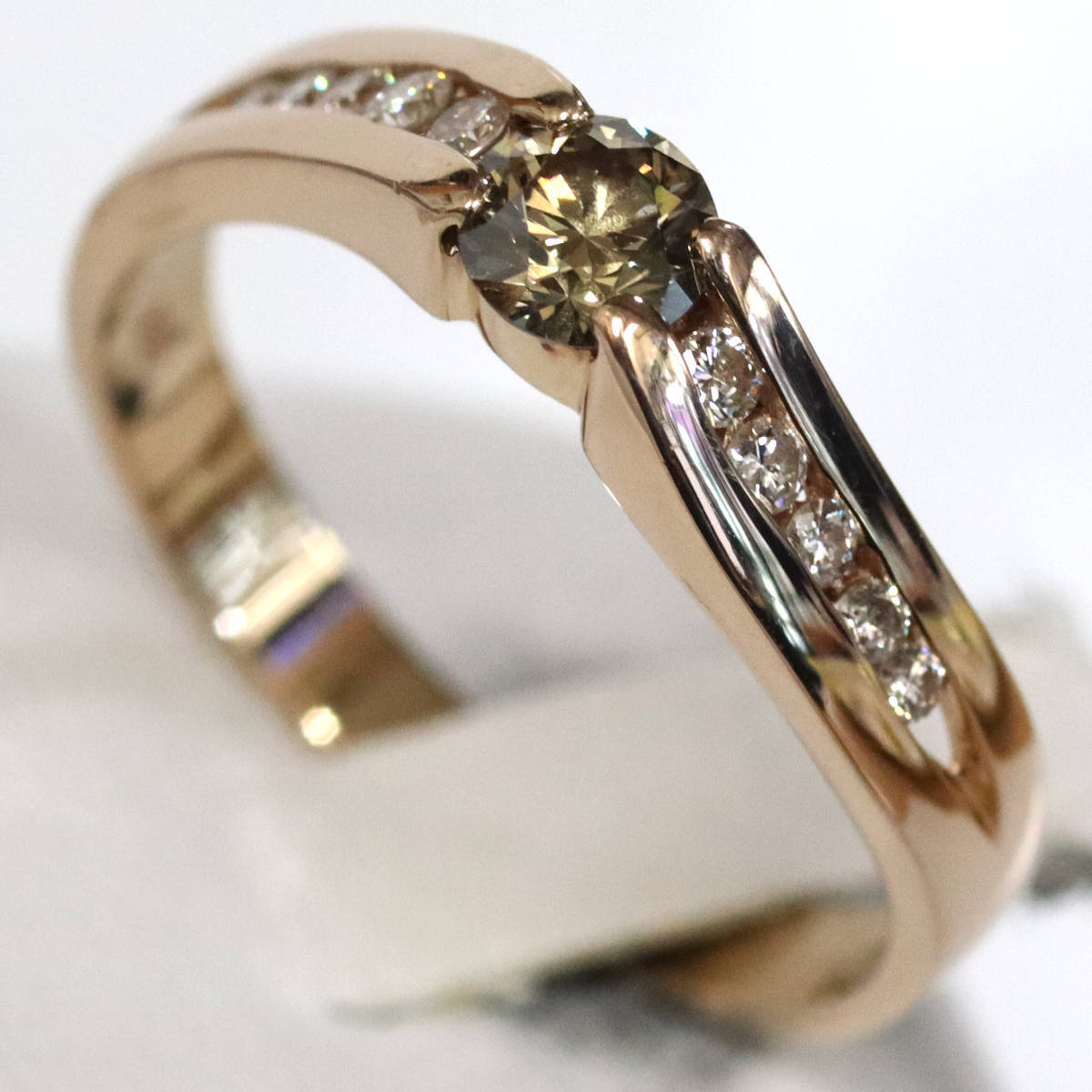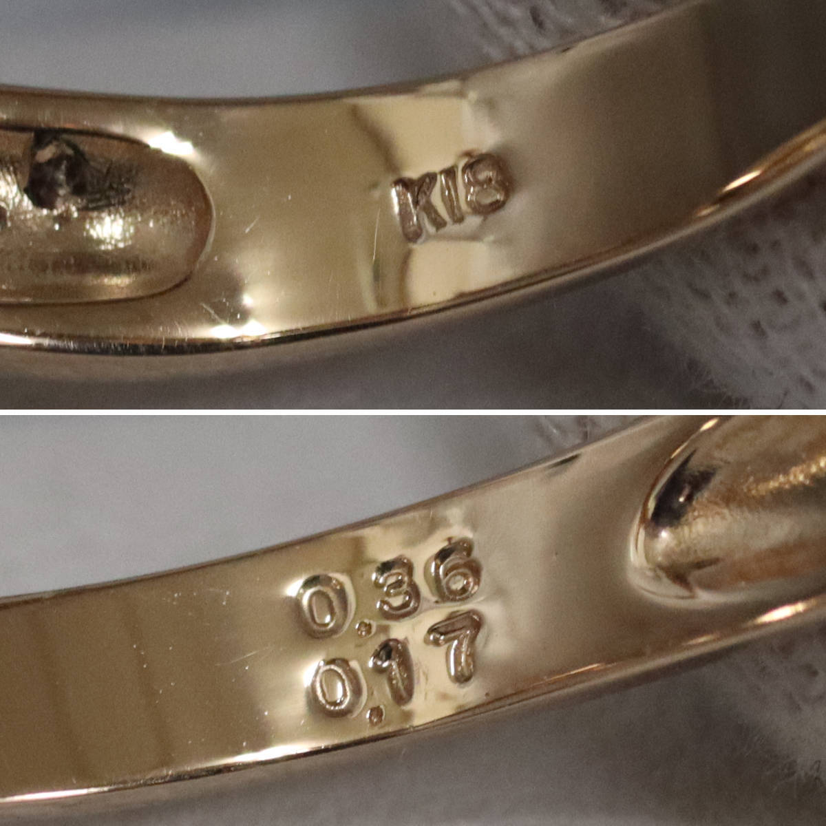 K18PGダイヤモンドリングの中古品です。 0.36カラットのダイヤモンドはブラウンがかったお色味です。 0.17カラットのダイヤモンドはややブラウンがかったお色味をしています。 インクルージョンは全体的に少ないです。 地金には小傷がございます。