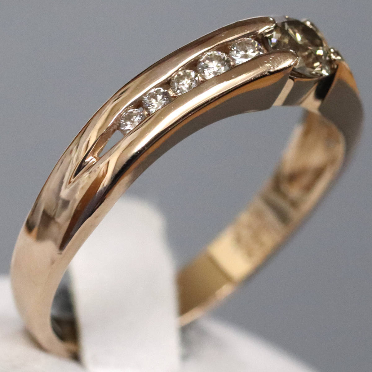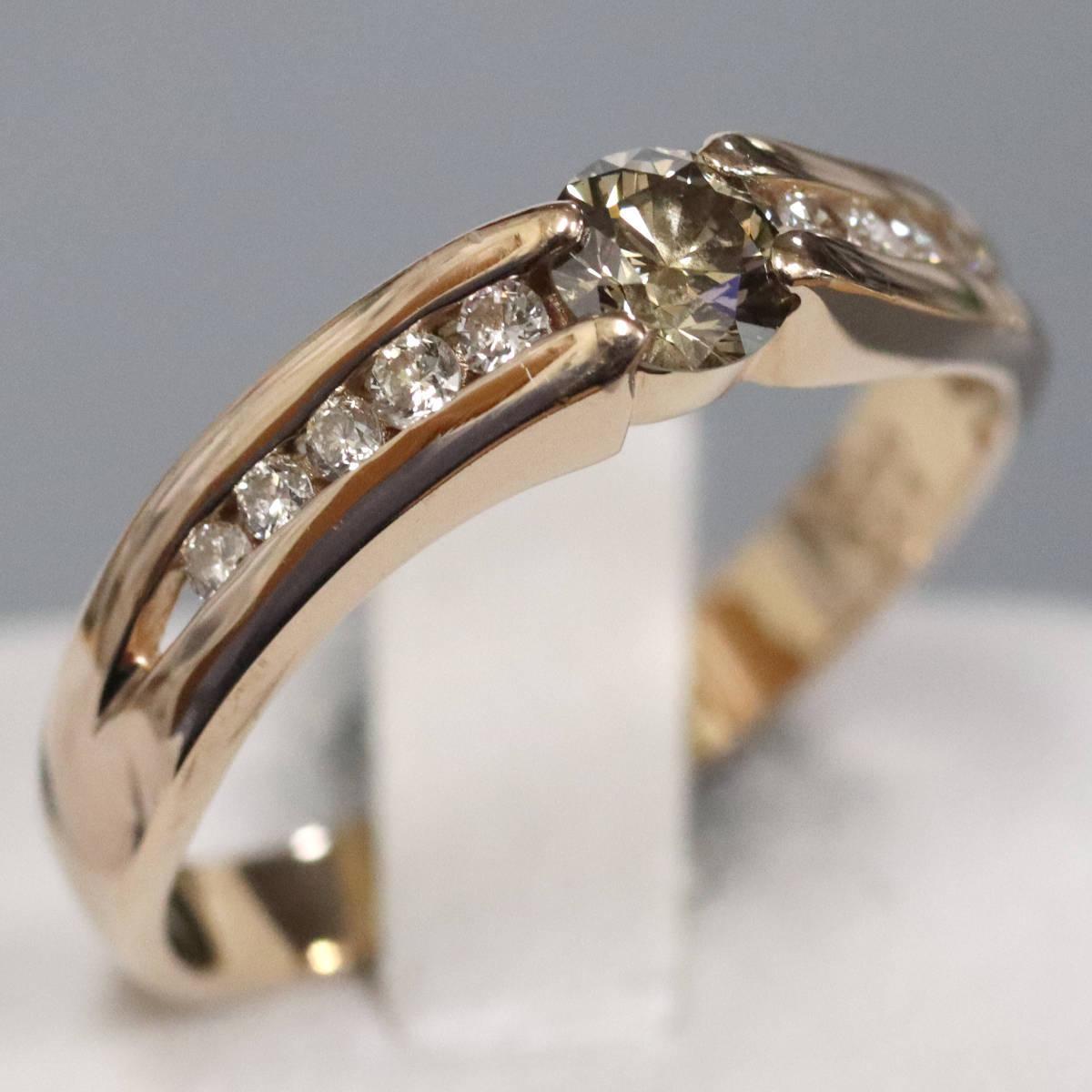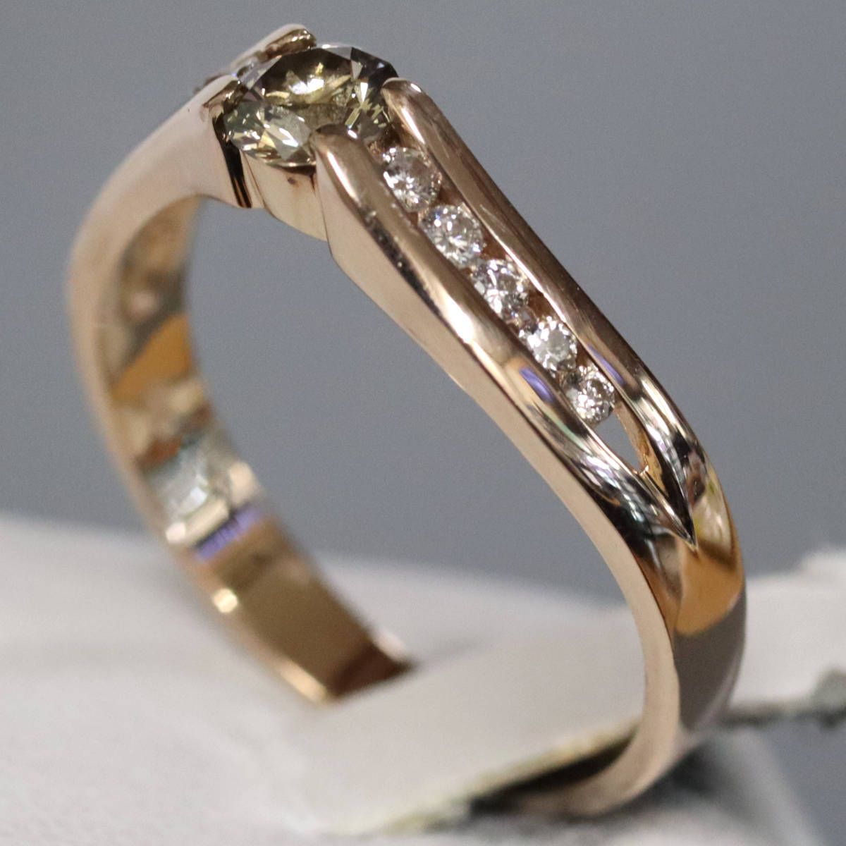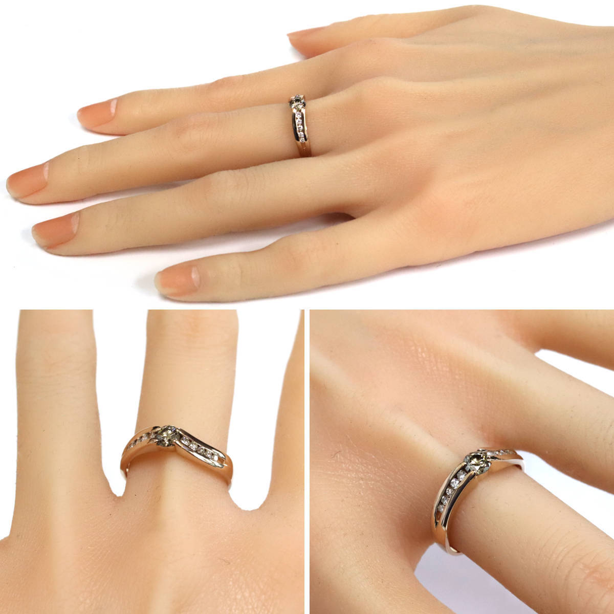 K18PGダイヤモンドリングの中古品です。 0.36カラットのダイヤモンドはブラウンがかったお色味です。 0.17カラットのダイヤモンドはややブラウンがかったお色味をしています。 インクルージョンは全体的に少ないです。 地金には小傷がございます。