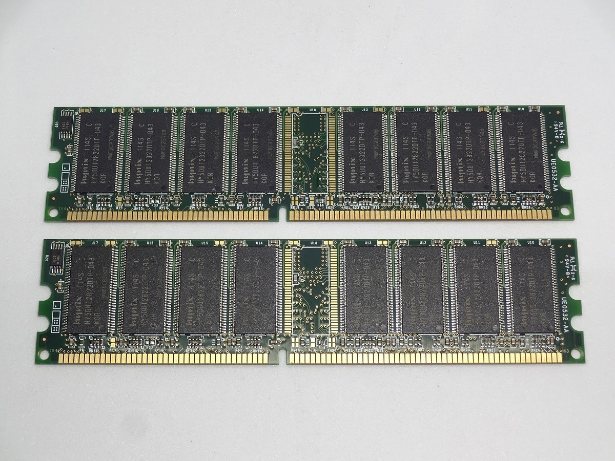 CFDのPC3200(DDR400)のDDR-SDRAMメモリ DD4333K-1G/H 1GB 2枚です。hynix製チップを両面に計16枚搭載しています。
