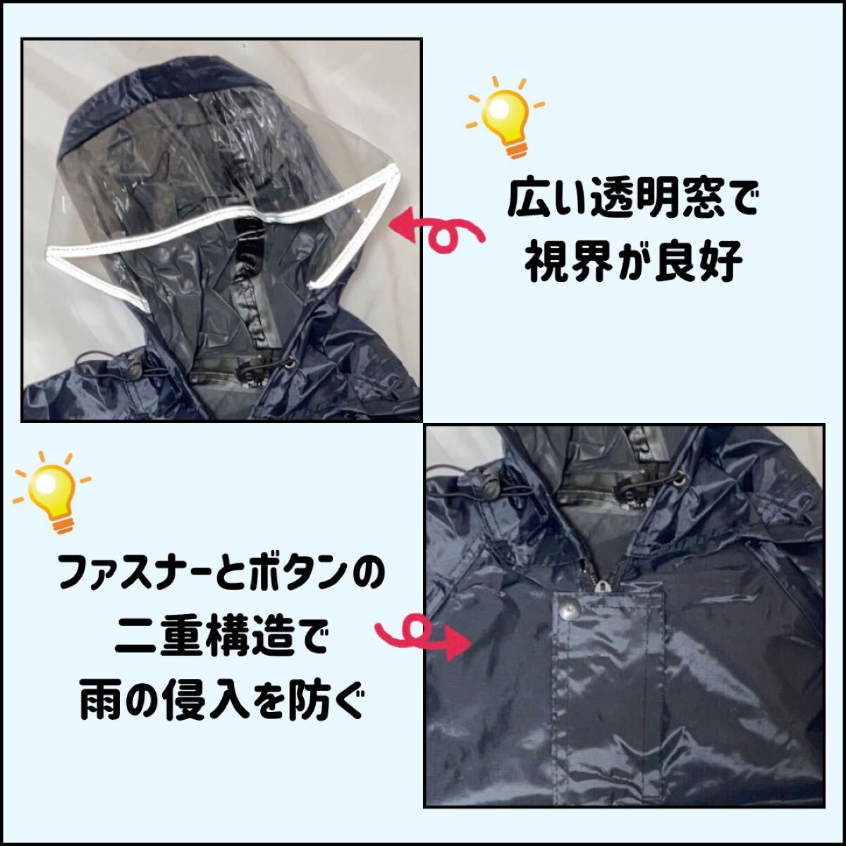 顔まわりのフードにはクリア素材を使用し、横からの視界も確保。自転車やバイクの運転も安心!