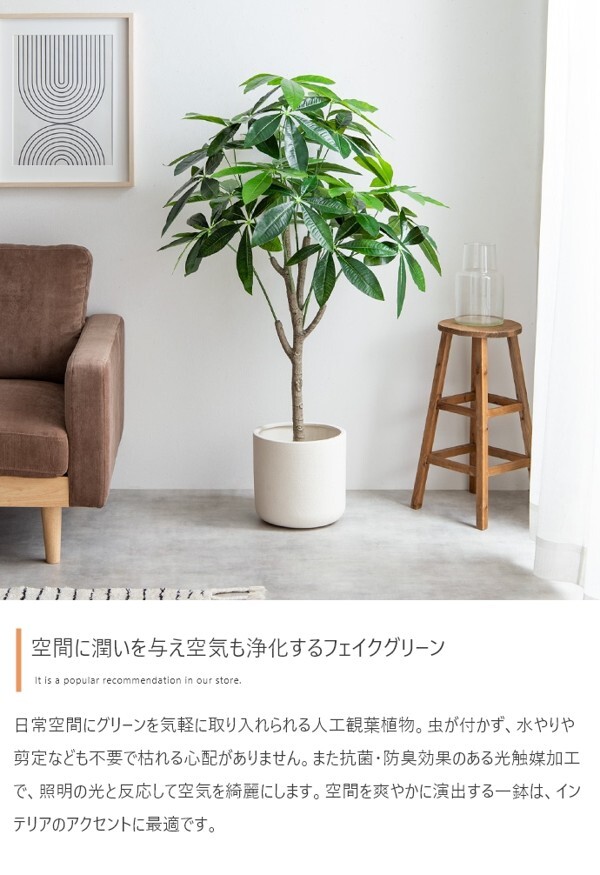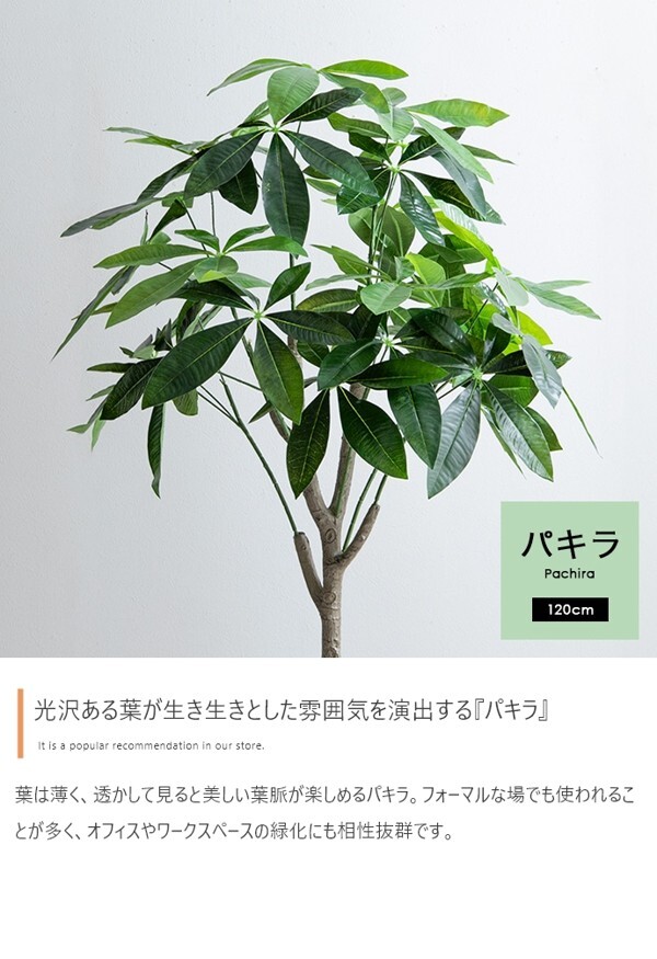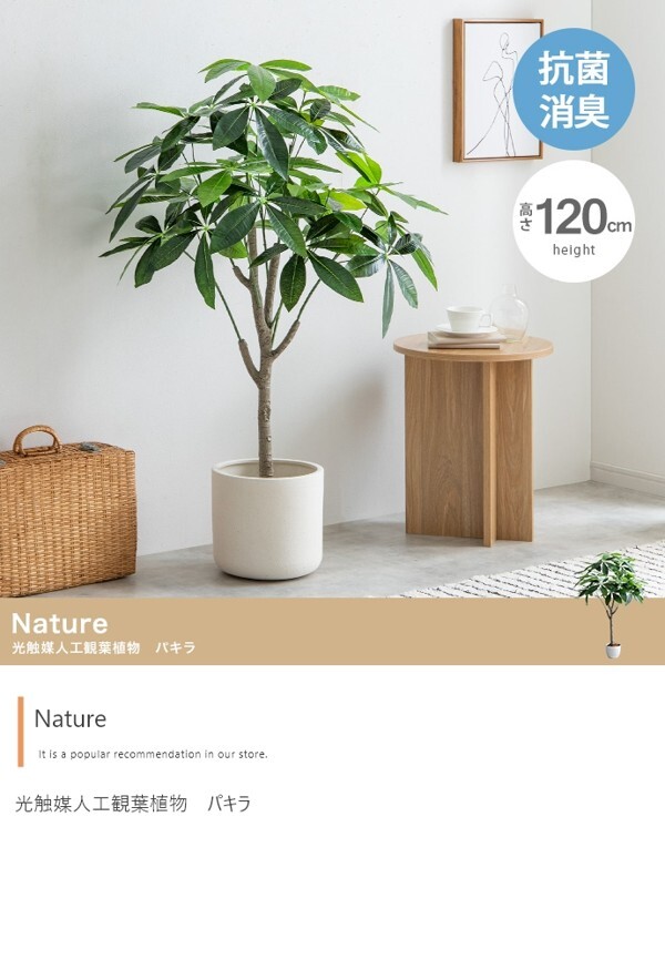 ※現在ご覧の商品ページはパキラのご購入ページとなります。 ヤフオクの仕様上単一ページに複数バリエーションを掲載することができませんので、他バリエーションが希望の場合は別ページでご購入お願い致します。 日常空間にグリーンを気軽に取り入れられる、光触媒人工観葉植物『Nature(ナチュレ)』シリーズのパキラ。 光触媒人工観葉植物は、照明光が当たることで消臭・抗菌・防汚・ホルムアルデヒド分解の効果を発揮します。 人工物でメンテナンスも簡単な観葉植物は、手軽に取り入れやすいのが魅力。 面倒な水やりや剪定が不要なので、忙しくてなかなか植物のお世話ができない方にもおすすめです。 また、ディテールにこだわり、自然な風合いを再現。 お部屋のインテリアに馴染むように細部まで丁寧に作り上げています。 配達業者を指定いただくことはできません。 沖縄・離島に関しましては、別途配送料が必要となります。 北海道への配送も別途配送料が必要になる場合がございます。 ※別途送料が発生する場合は後ほどご連絡させていただきます。 タイミングによっては在庫切れの場合があります。