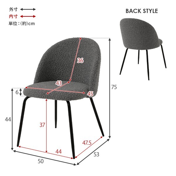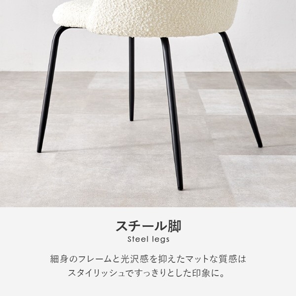※現在ご覧の商品ページはダークグレーのご購入ページとなります。 ヤフオクの仕様上単一ページに複数バリエーションを掲載することができませんので、他バリエーションが希望の場合は別ページでご購入お願い致します。 ぽこぽことした質感が特徴的なブークレ生地のダイニングチェア。 細身のスチール脚と合わせてスッキリしつつも温かみのある空間を演出します。 配達業者を指定いただくことはできません。 北海道/沖縄/離島のお届けに別途中継料金が発生します。 ※別途送料が発生する場合は後ほどご連絡させていただきます。 当店は正規店です。 タイミングによっては在庫切れの場合があります。