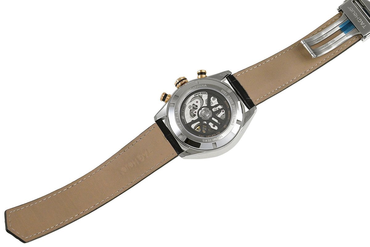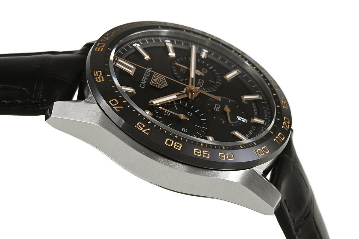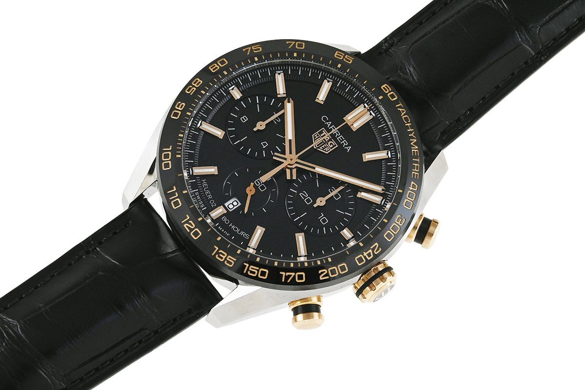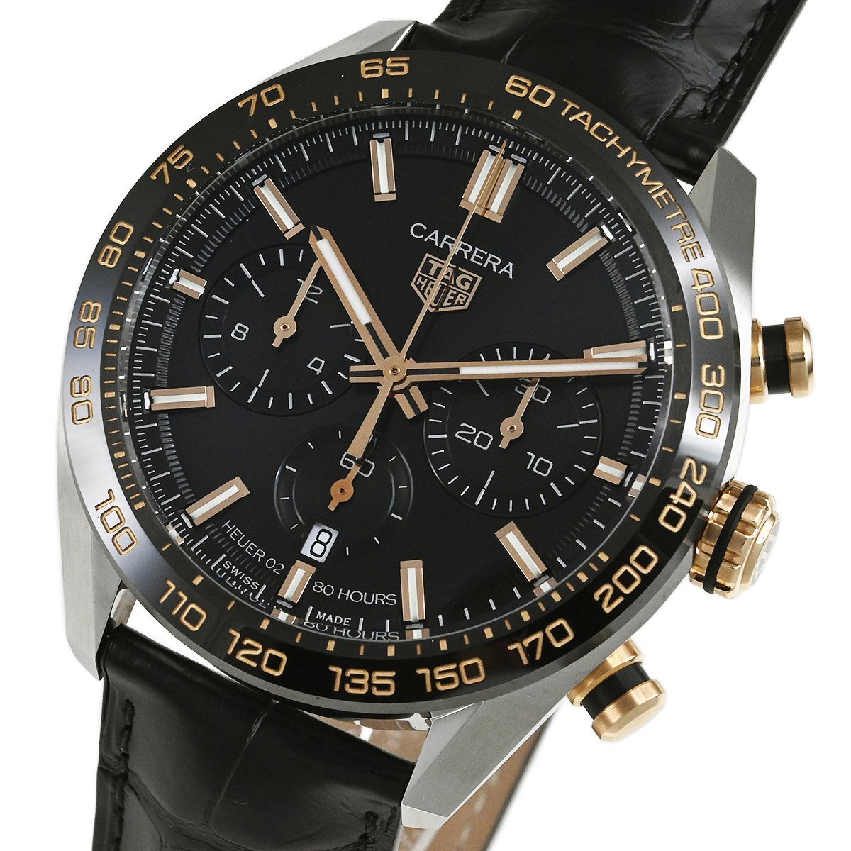 【コメント】 モーターレースからインスピレーションを得たクラシックながら現代的なスポーツウォッチ「カレラ」シリーズ。タグ・ホイヤー自社製ムーブメント「キャリバー ホイヤー02」搭載モデルです。スポーティーでエレガントなデザインが魅力的、ブラック×ローズゴールドカラーがラグジュアリーな印象です。少々の軽い擦れ、革ベルトに軽い巻き癖、Dバックルの留め痕はありますが未使用の状態です。2024年12月に購入品で、現在精度は平置きで日差+3秒程です。