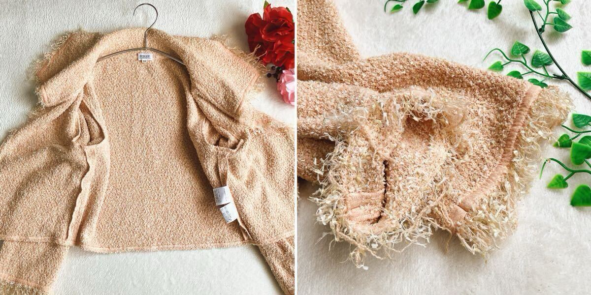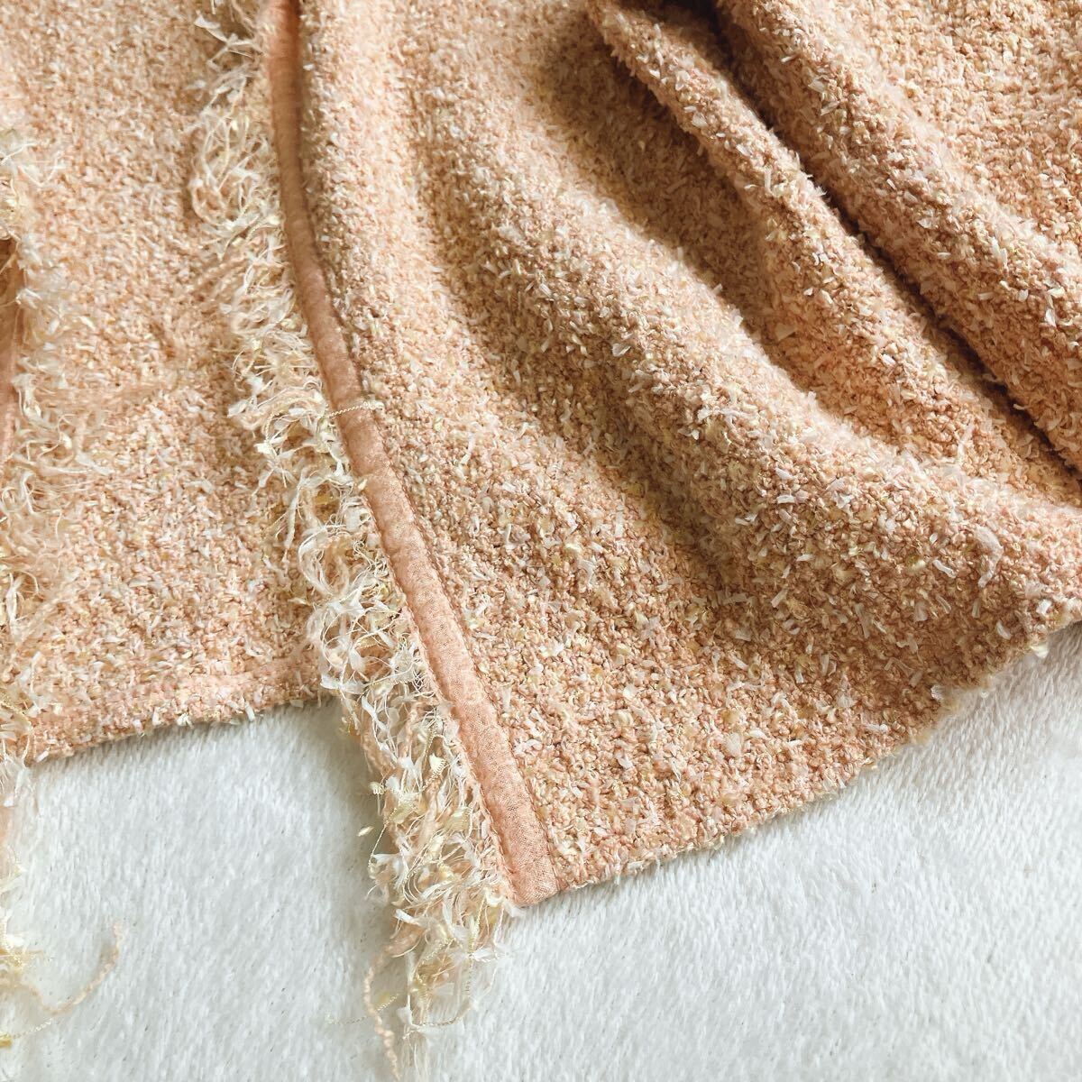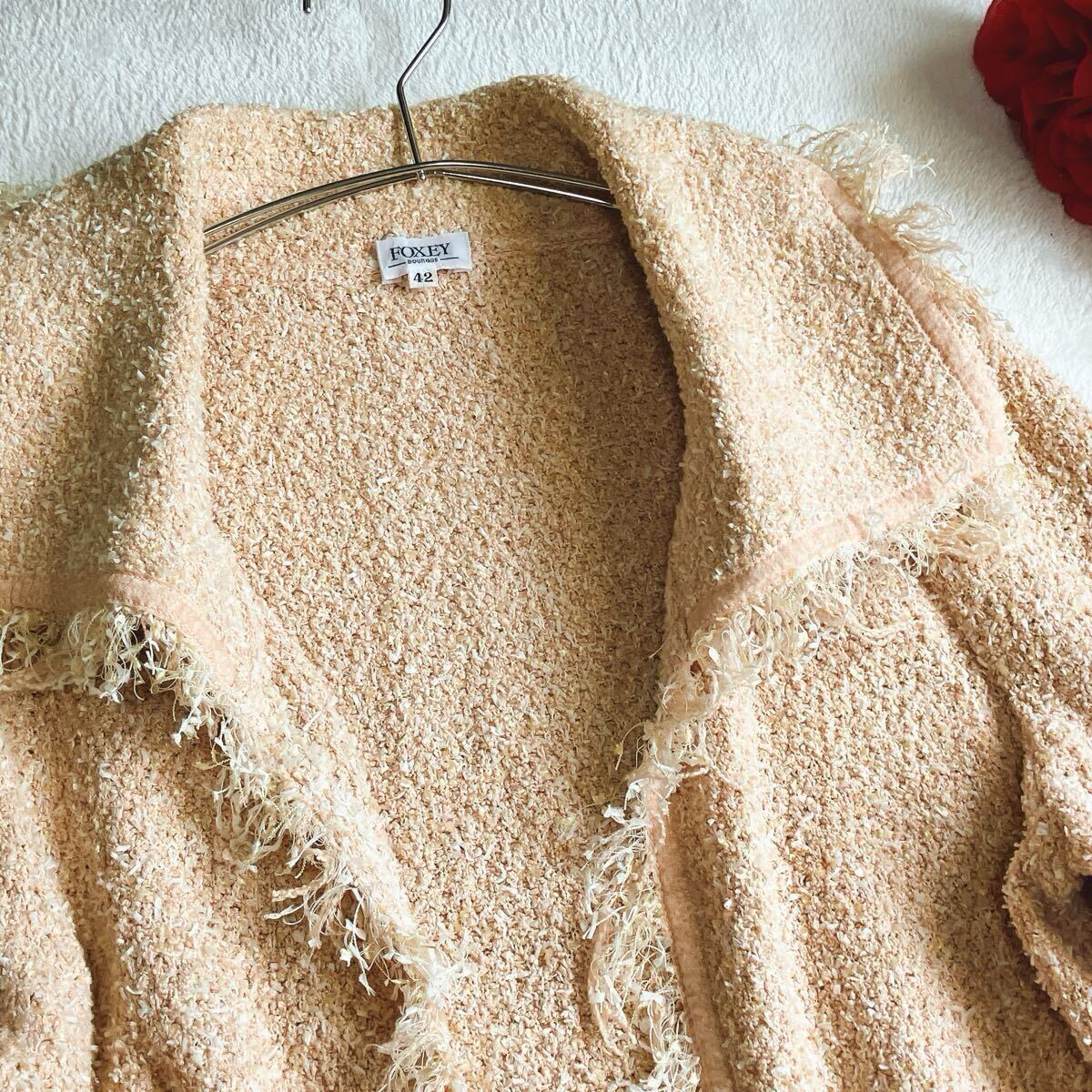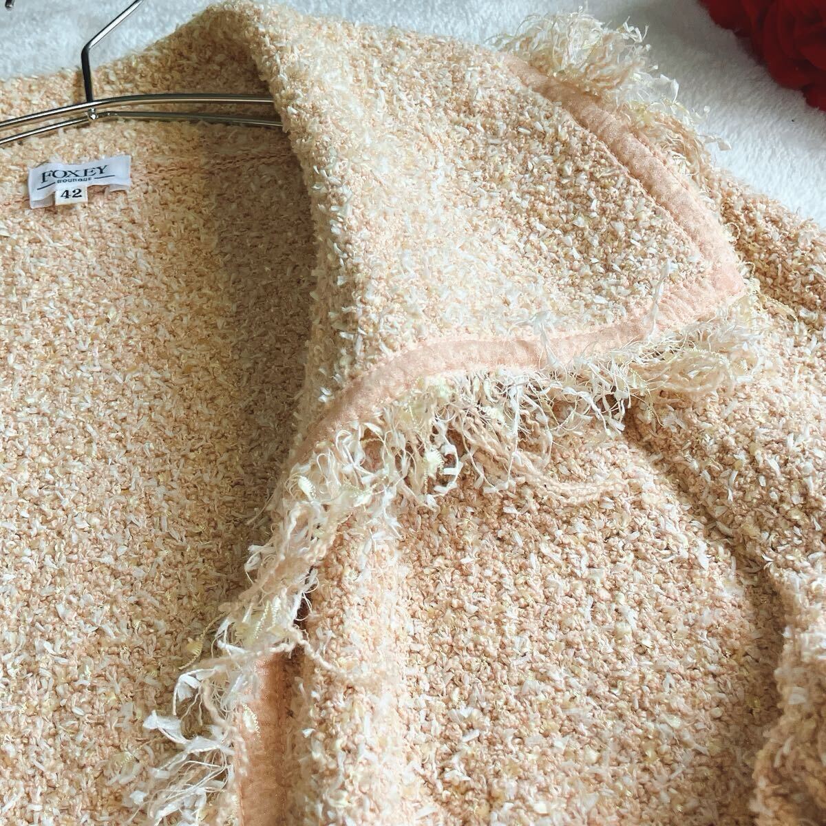 淡いライトオレンジにマルチカラーが織り交ぜられ、春先や秋口のコーデにぴったり。フォクシーらしい上品なカラーが女性らしさを引き立てます。