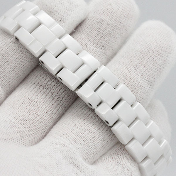 清潔感あふれるホワイトセラミックに、12ポイントのダイヤモンドインデックスが華やかに輝くラグジュアリーモデル。