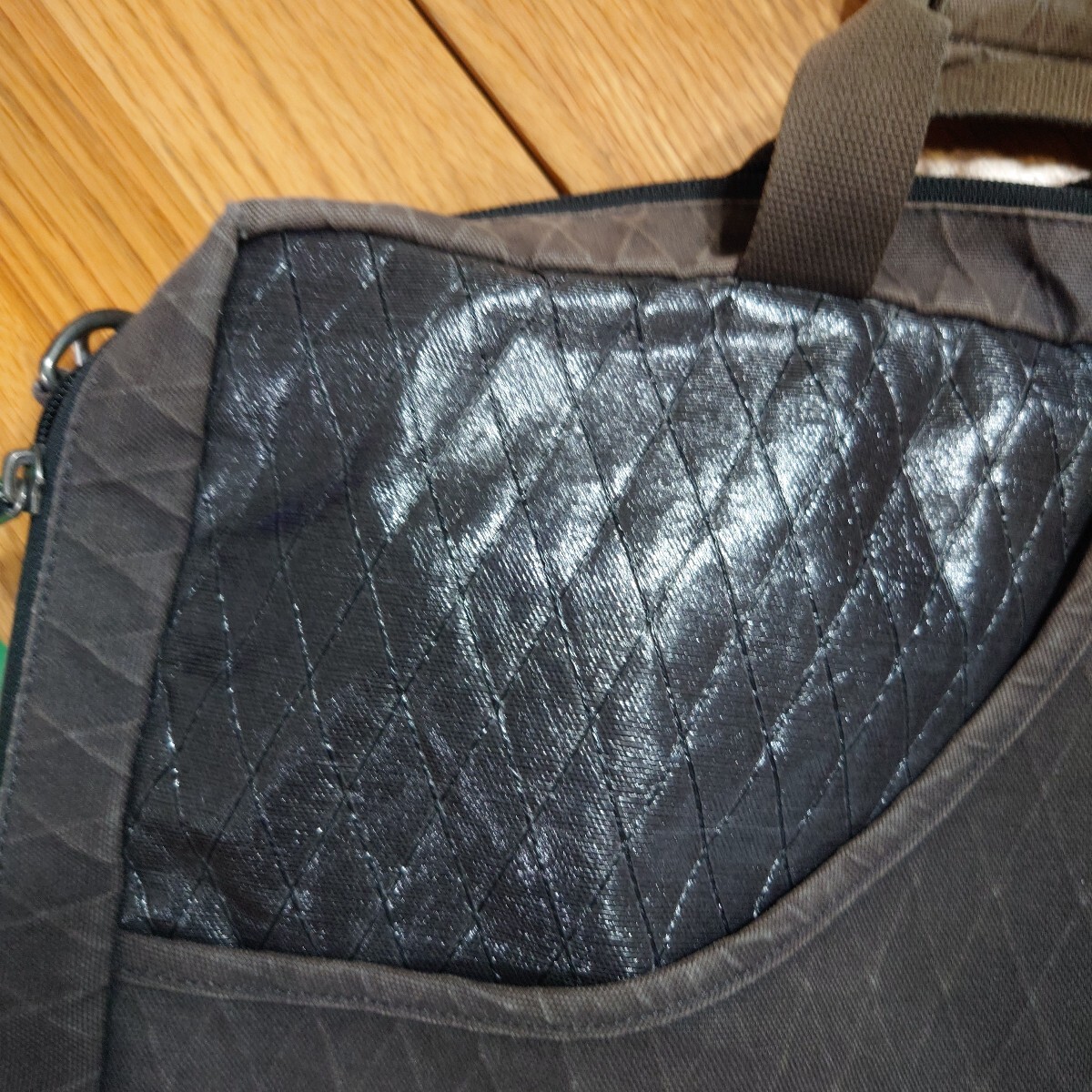 本体:防水性リップストップで補強し、PETフィルムをラミネートした、2層構造の11.3オンス・オーガニックコットン・キャンバス100%。DWR(耐久性撥水)加工済み。裏地:3.3オンス・200デニール・リサイクル・ポリエステル100%