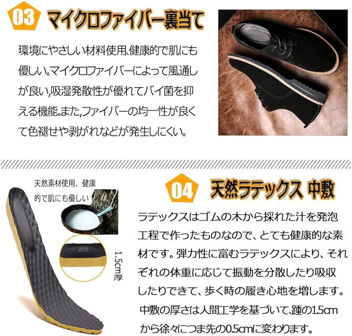 【衝撃吸収 ラテックス中敷】高反発素材を全面に採用し、衝撃吸収性が高いです。中敷の厚さは人間工学を基づいて、踵の1.5cmから徐々につま先の0.5cmに変わります。弾力性に富むラテックスにより、それぞれの体重に応じて振動を分散したり吸収したりできて、歩く時の履き心地を増します。防臭加工により、嫌なニオイを抑えることができます。