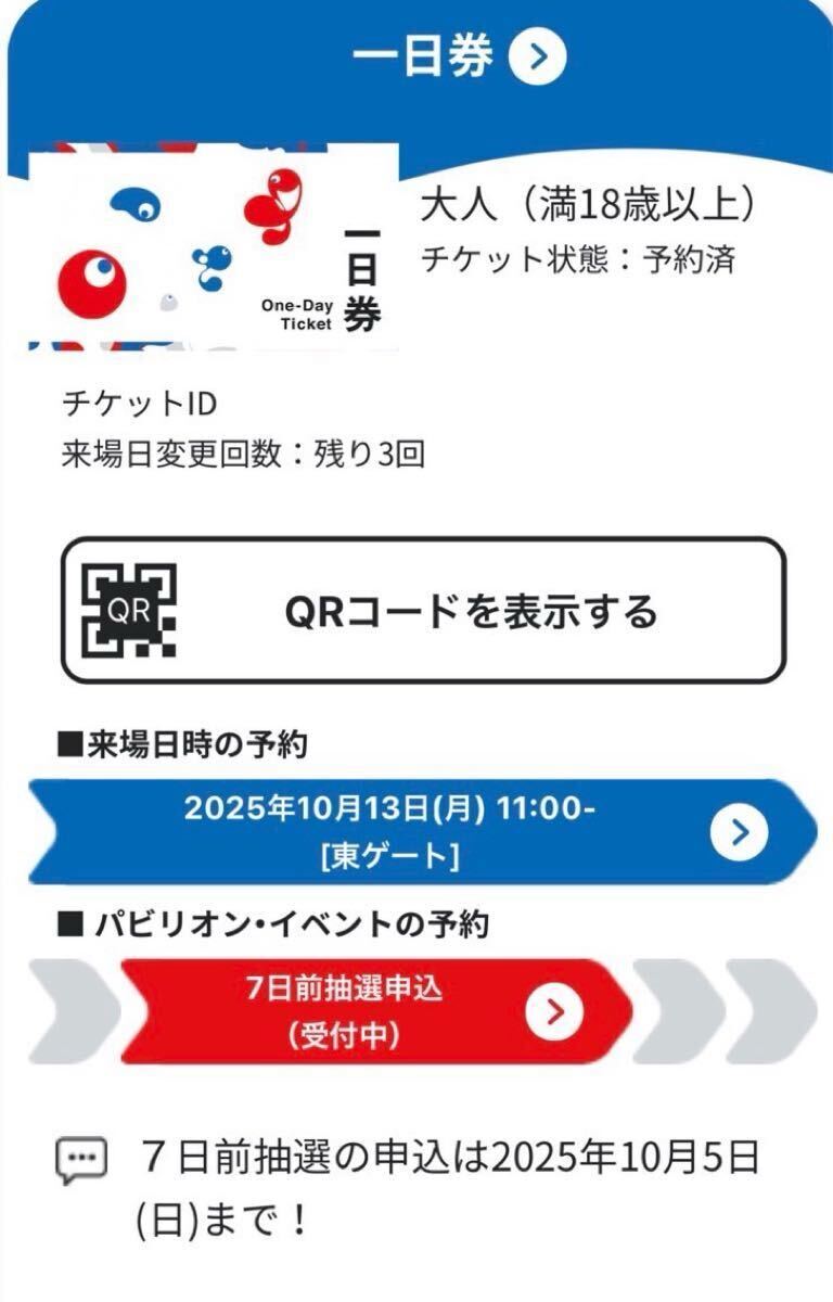 入場予約日程変更は出来ませんが、パビリオンの7日前抽選は10/5迄可能です