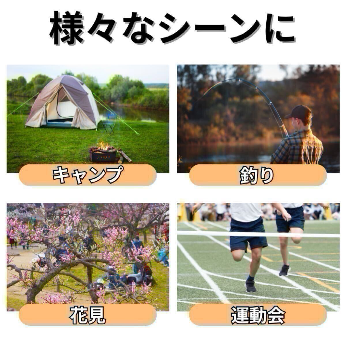 キャンプ/釣り/ピクニック/フェス/運動会/バーベキュー/登山/お花見/花火大会/公園遊び/旅行中の休憩/災害時の備え etc.