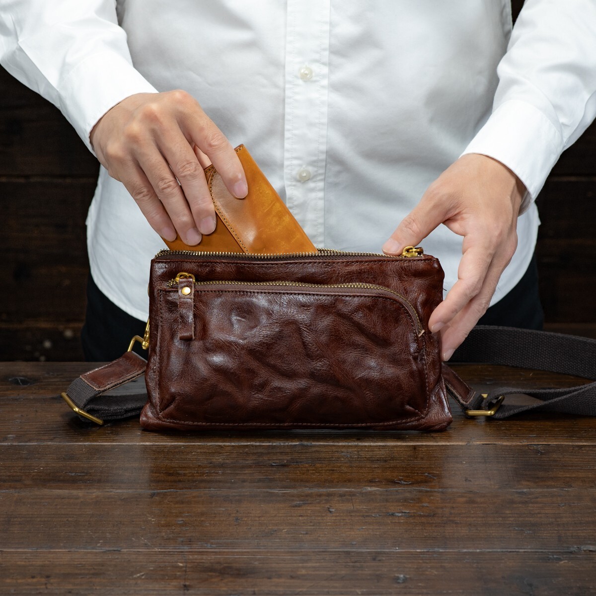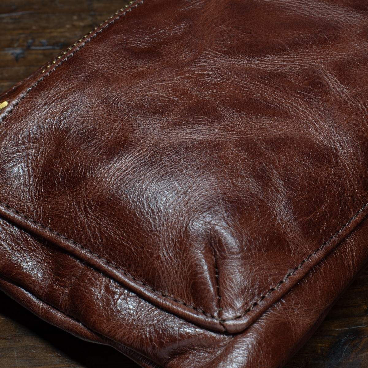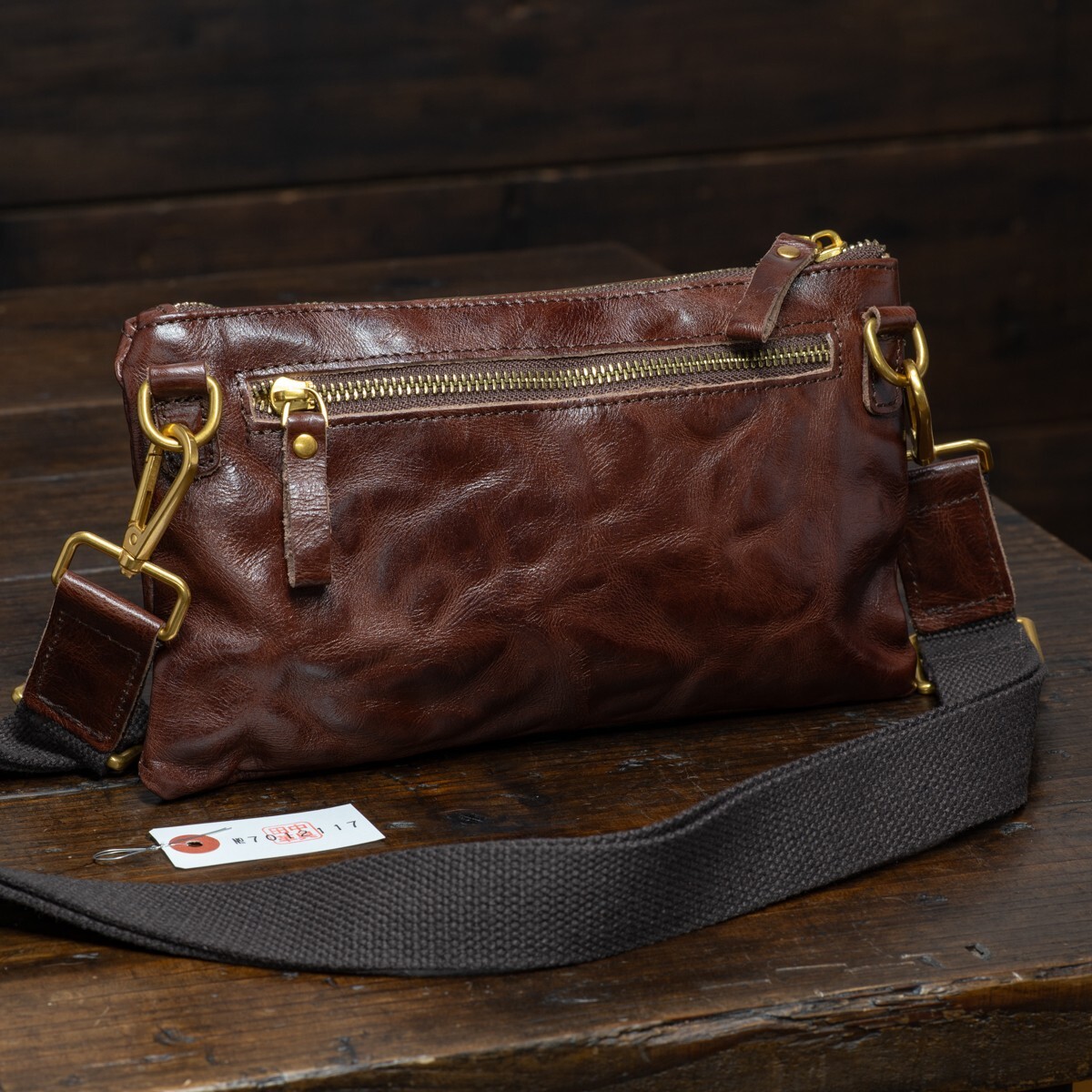 ウォッシュレザーを使ったアンティークな雰囲気のミニショルダーバッグです。ダークブラウンの落ち着いた色合いが、大人の装いにも自然に馴染みます。