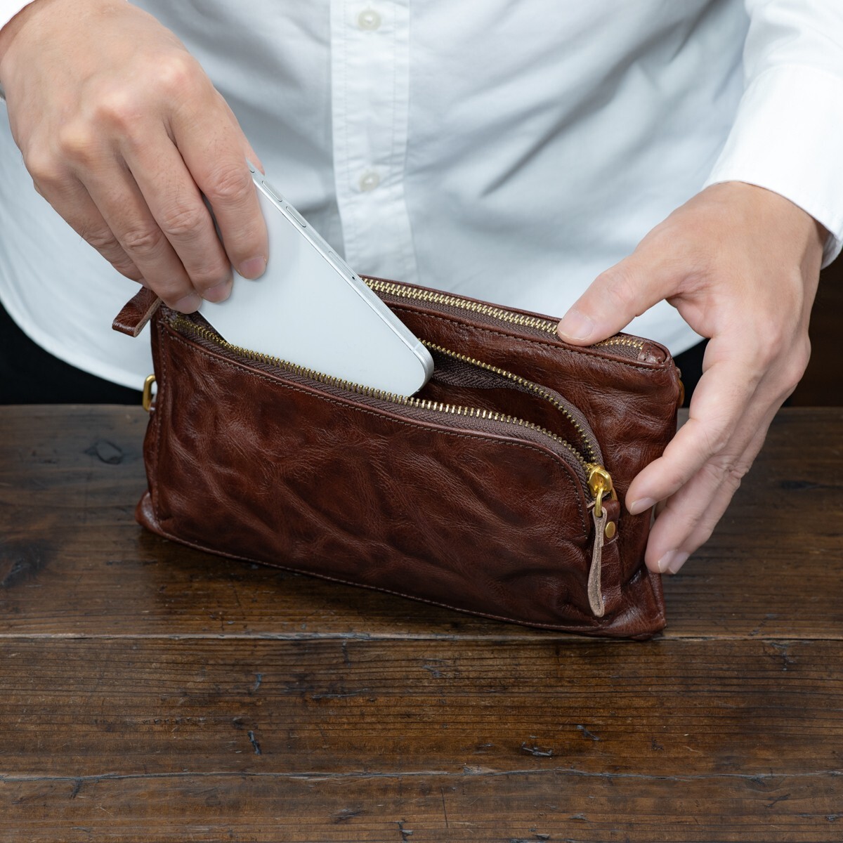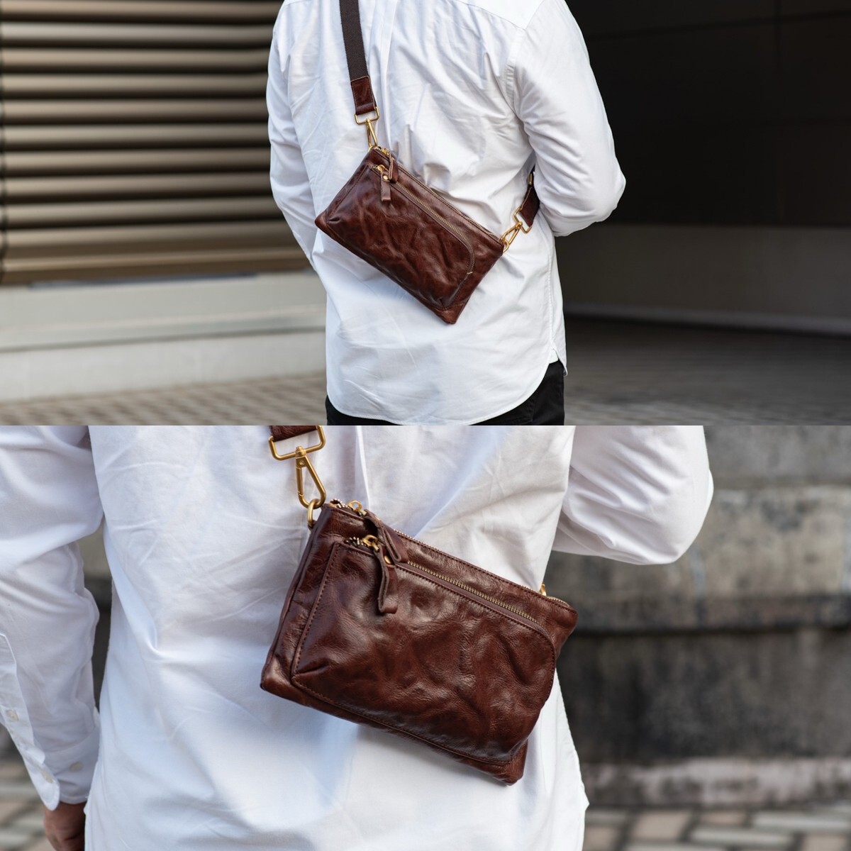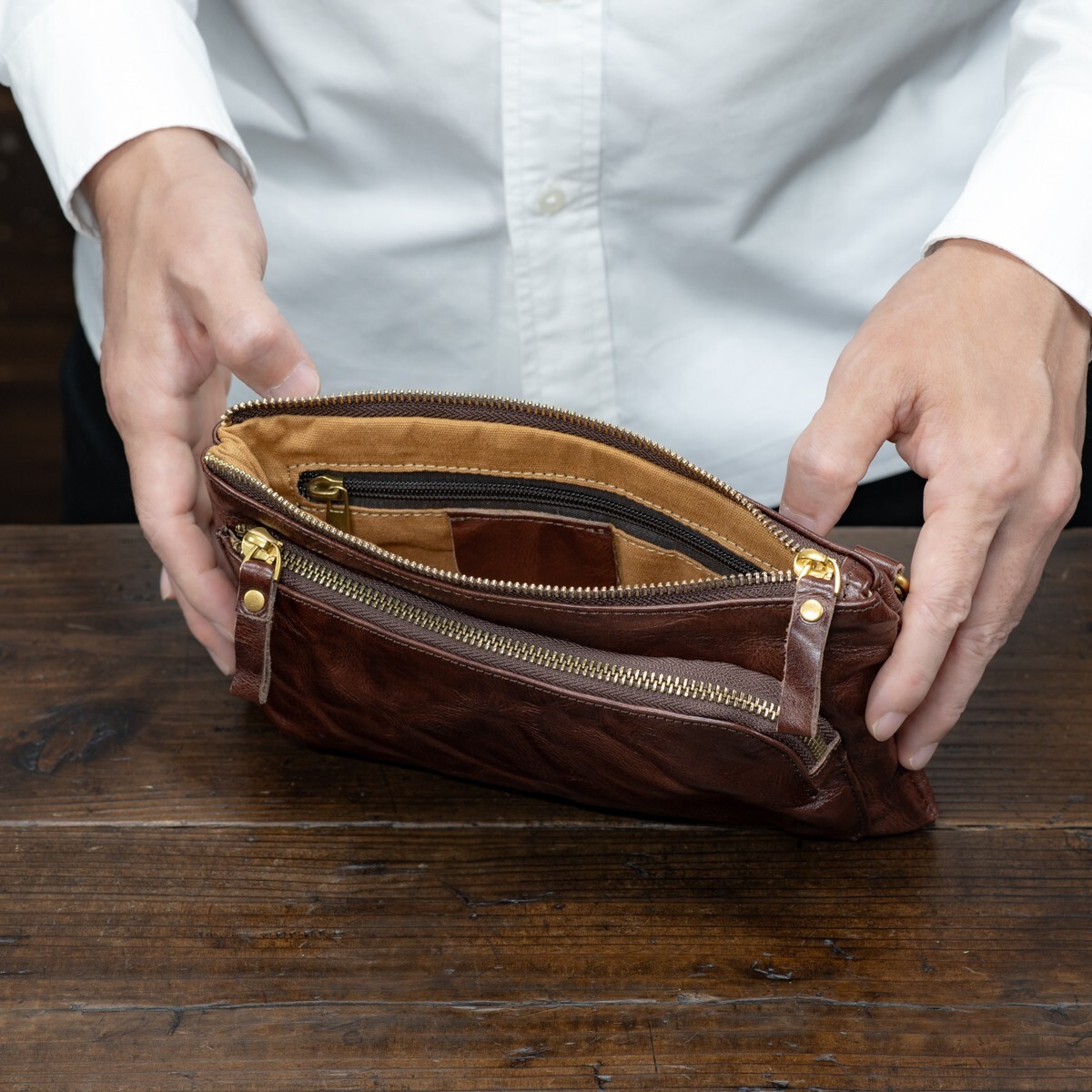 ウォッシュレザーを使ったアンティークな雰囲気のミニショルダーバッグです。ダークブラウンの落ち着いた色合いが、大人の装いにも自然に馴染みます。
