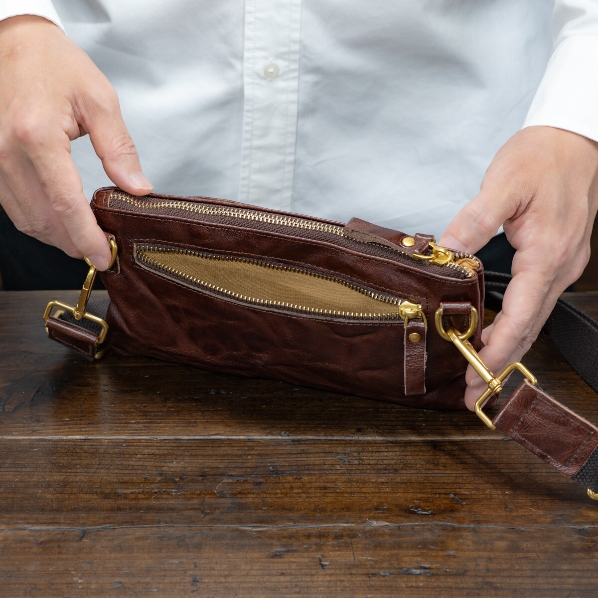 素材:本革(本体)/キャンバス地(ショルダーベルト・内装)