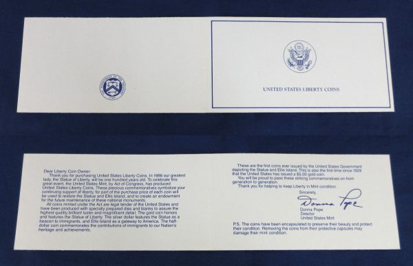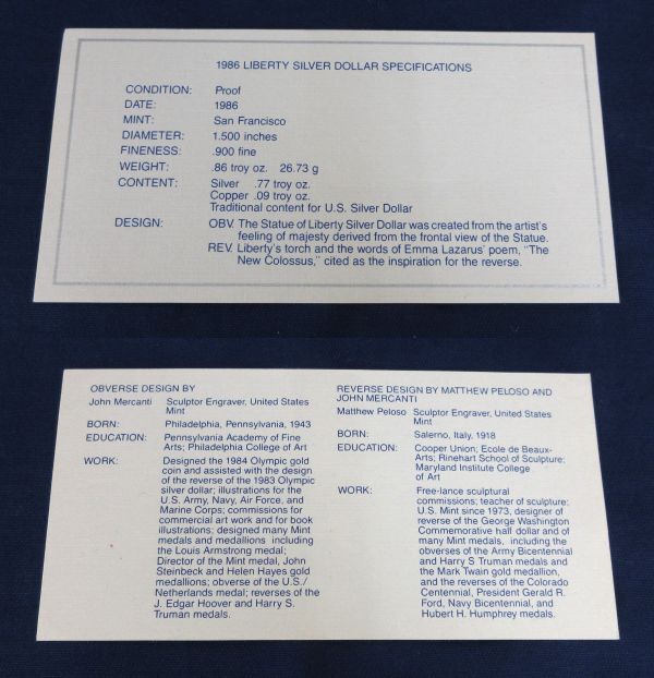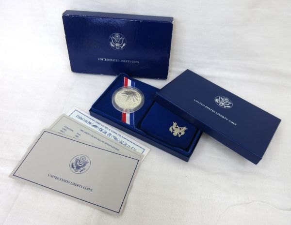 ▼UNITED STATES LIBERTY COIN▼yz25 ◎1986年発行の1ドルプルーフ貨幣が一枚のセットになります。 ◎1ドル貨幣×1枚 ◎ケース×1個 ◎保証書×1枚 ◎付属リーフレット×全2枚 以上がセットの内容になります。