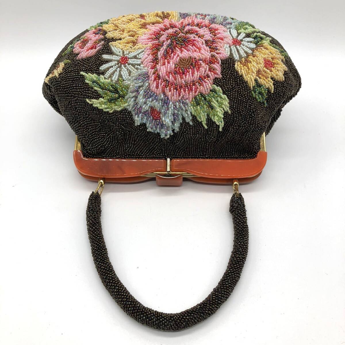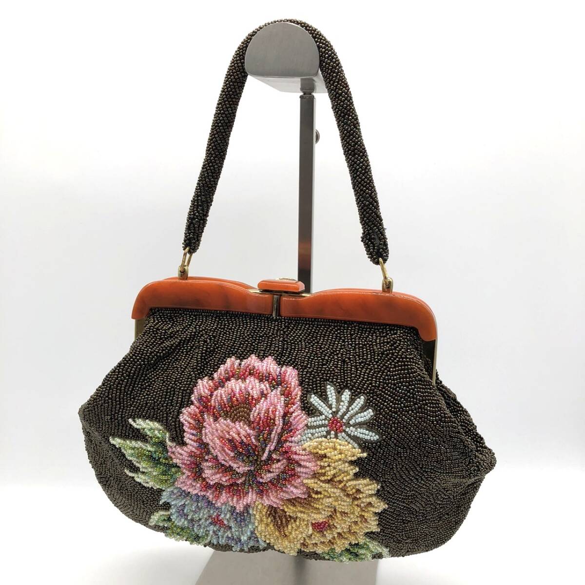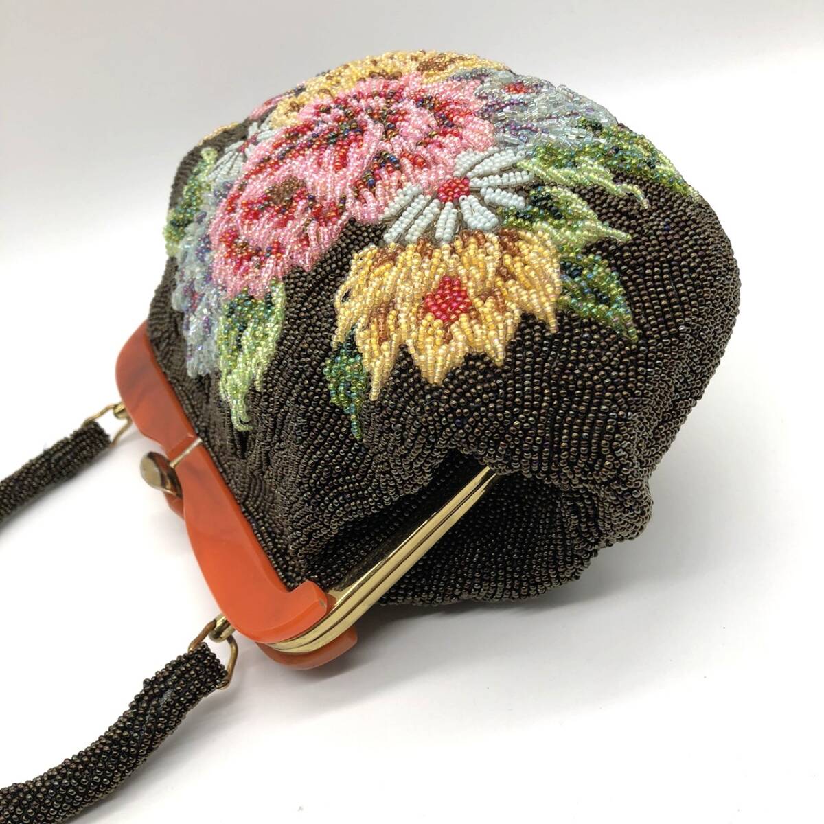 昭和レトロ ビーズバッグ がま口ハンドバッグ 大きめ ヴィンテージ お茶会 パーティー 礼装 洋装 和装 ブラウン系花柄 訳あり |
