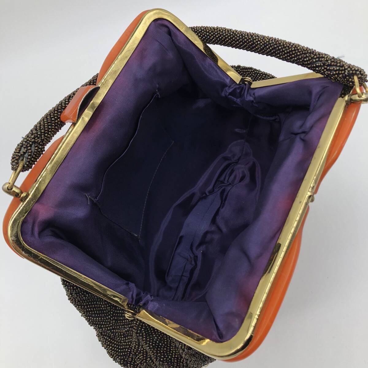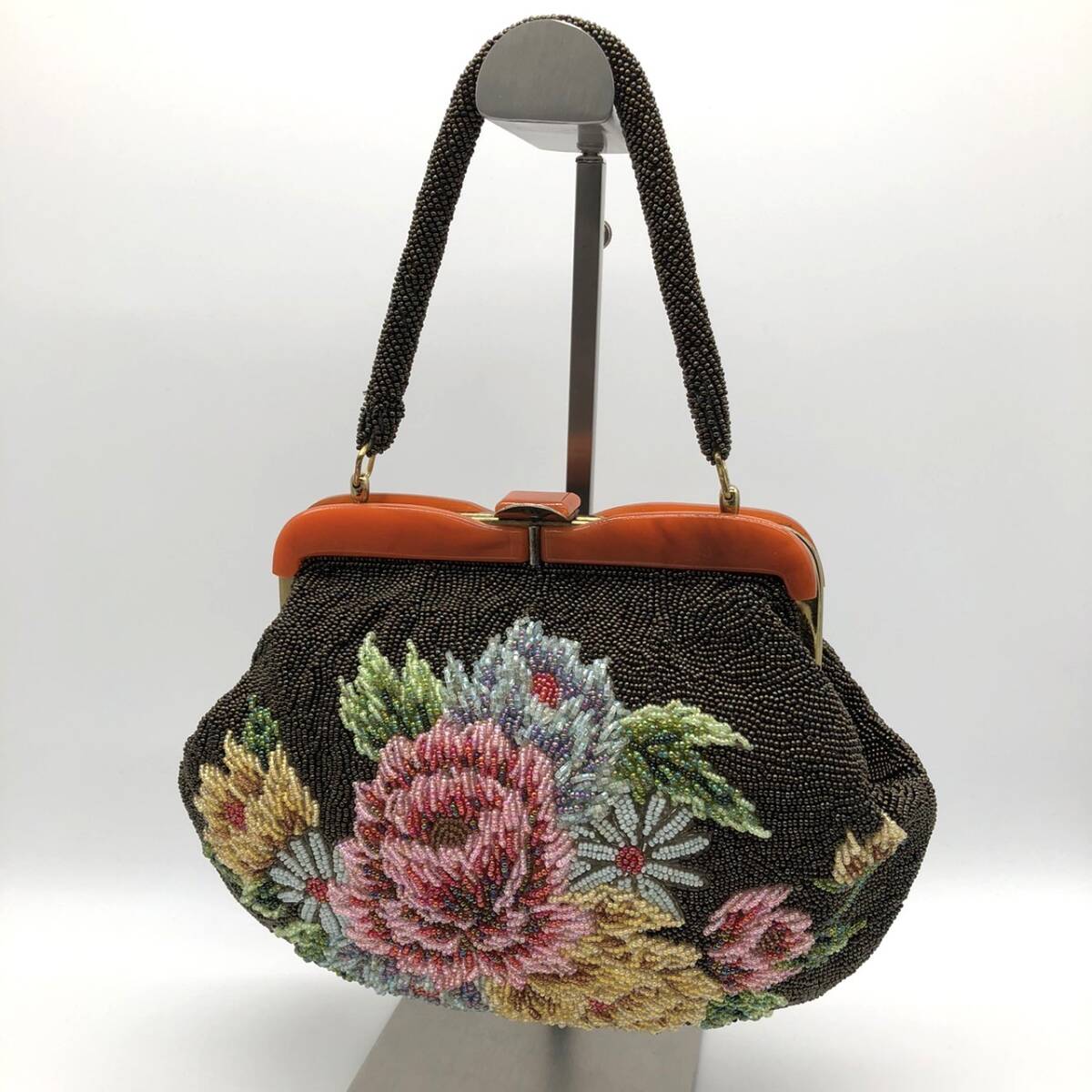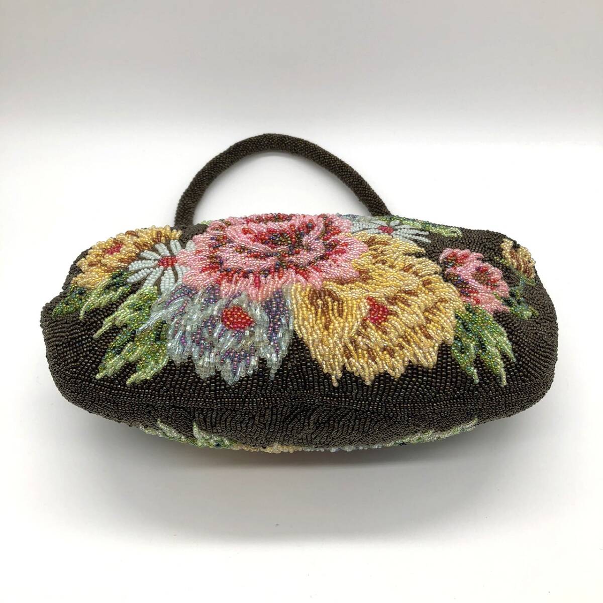 昭和レトロ ビーズバッグ がま口ハンドバッグ 大きめ ヴィンテージ お茶会 パーティー 礼装 洋装 和装 ブラウン系花柄 訳あり |