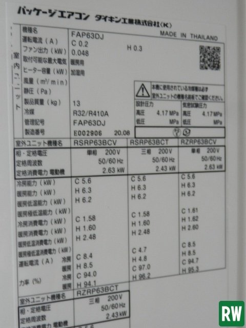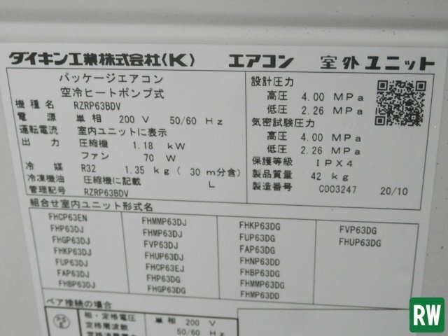 | 【2.5馬力】ルームエアコン ダイキン 内機:FAP63DJ 外機:RZRP63BDV 単相200V 2020年製 壁掛形 業務用 冷房 22畳 |
