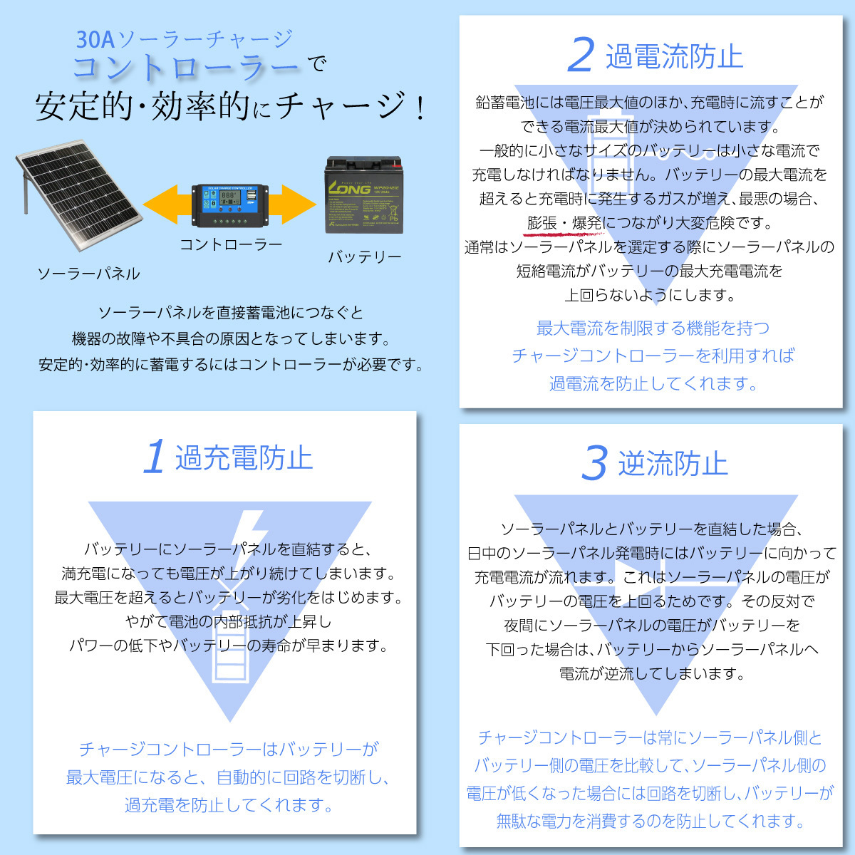 電圧 12V/24V 定格充電電流 30A 定格放電電流 30A 制御方式 PWMパルス変調 電力量表示 あり 警告ランプ あり 放電遮断電圧 10.7V(デフォルト) 放電回復電圧 12.6V(デフォルト) USB出力ポート 5V/3A 待機電流 ≦10mA 使用環境温度 -30℃~60℃ 使用可能蓄電池 鉛バッテリー(リチウム不可) サイズ 133×70×35mm |