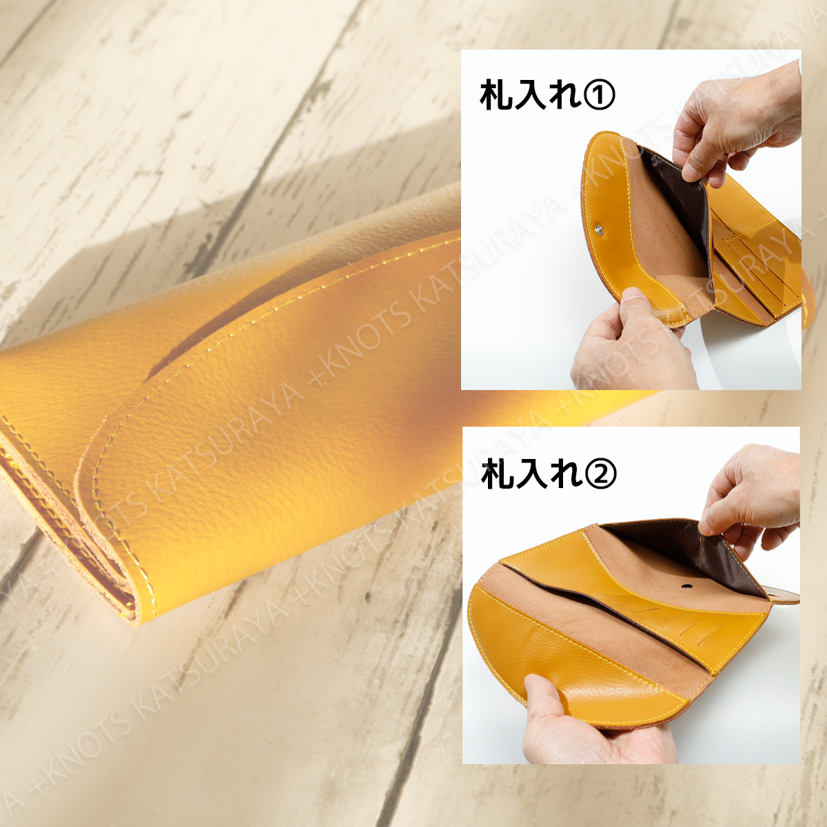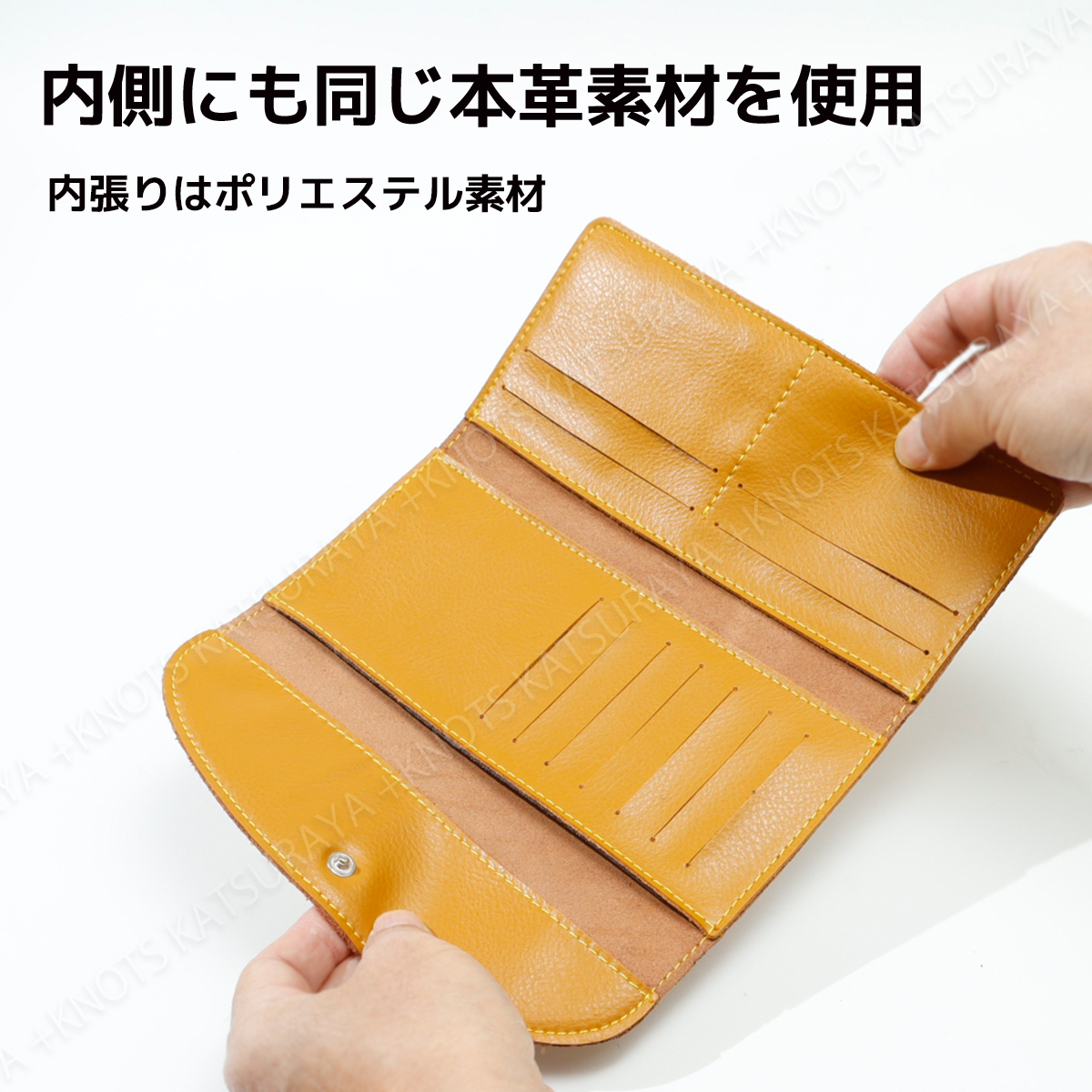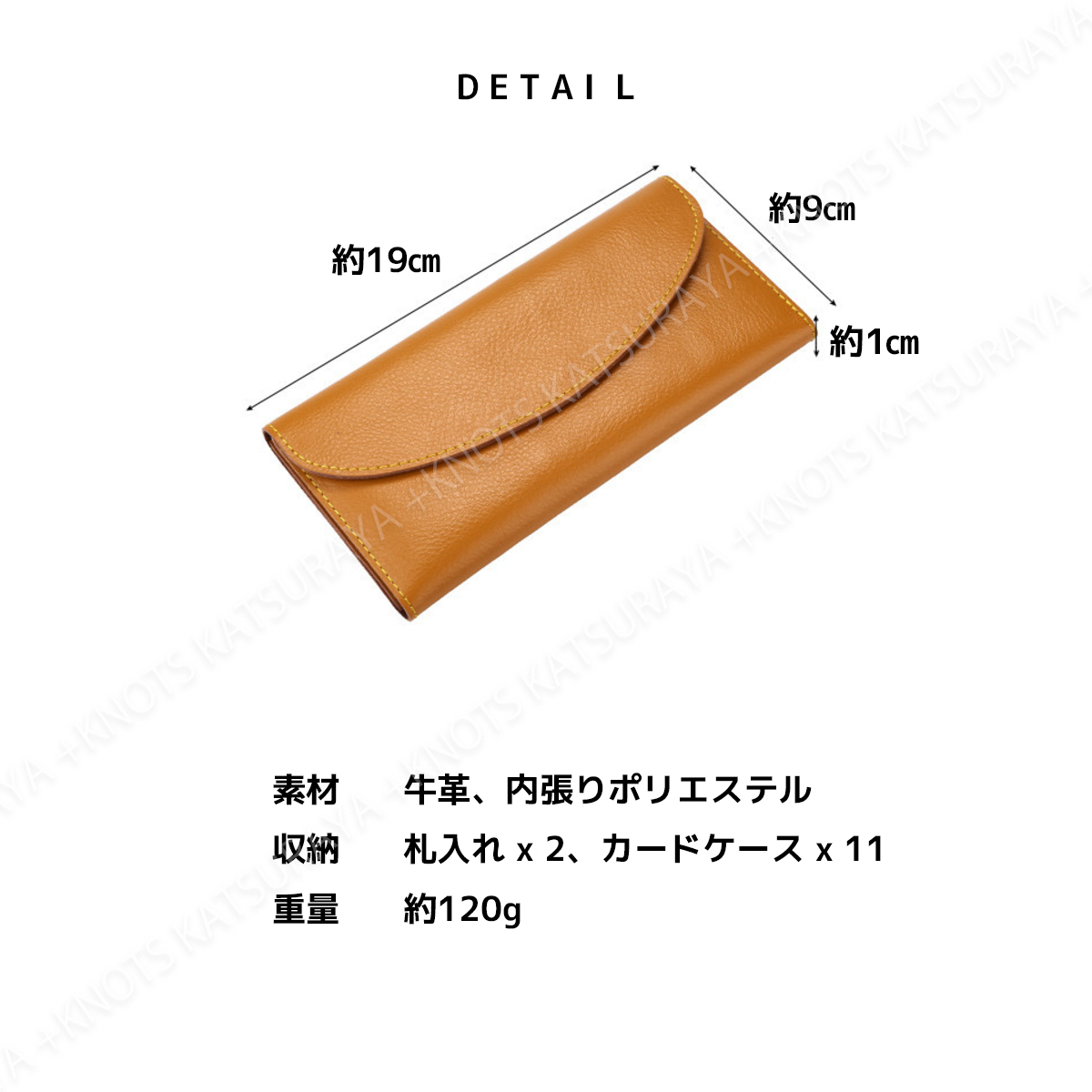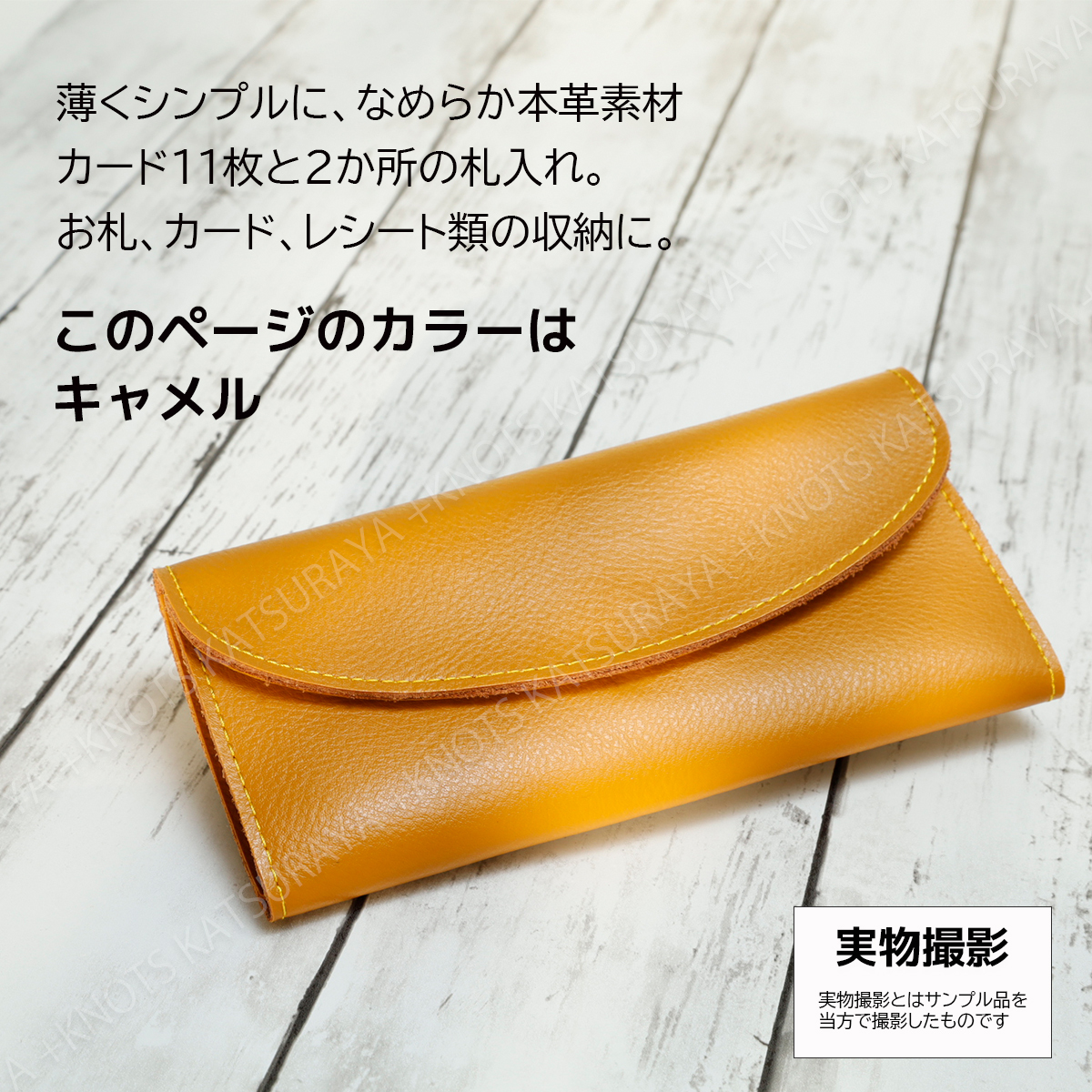 本革で作った、お札を折らずに収納できる薄型の三つ折り長財布です。カードケース11か所と札入れ2か所のシンプルな構造、小銭入れはありません。内部にも外側と同じ牛革を使用しています。レシートなどの仕分けにも便利です。