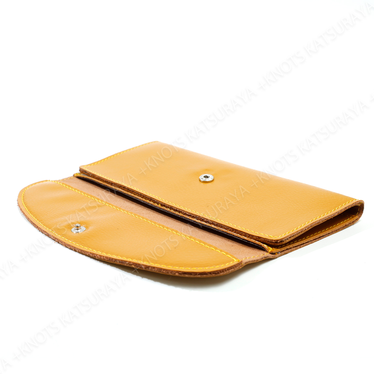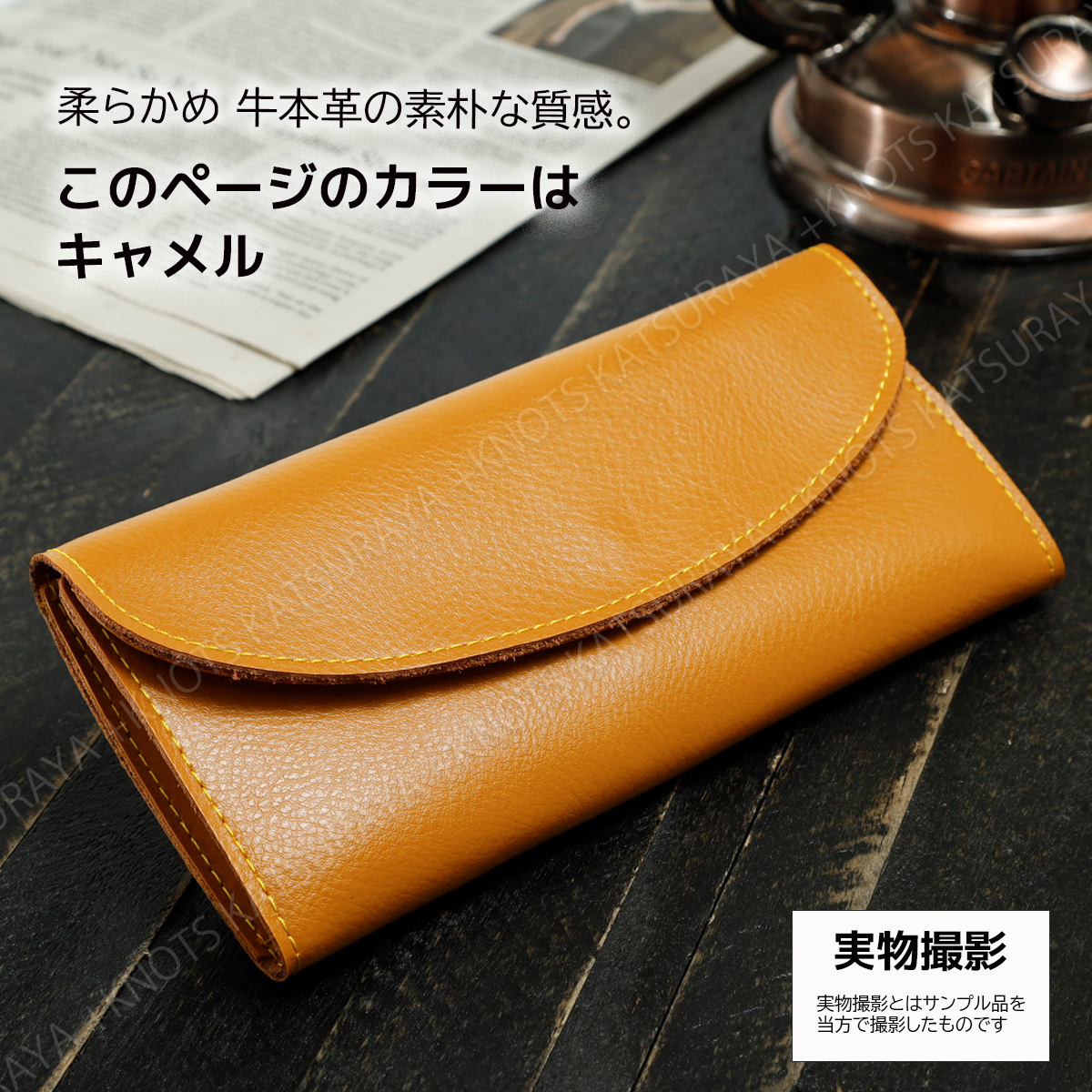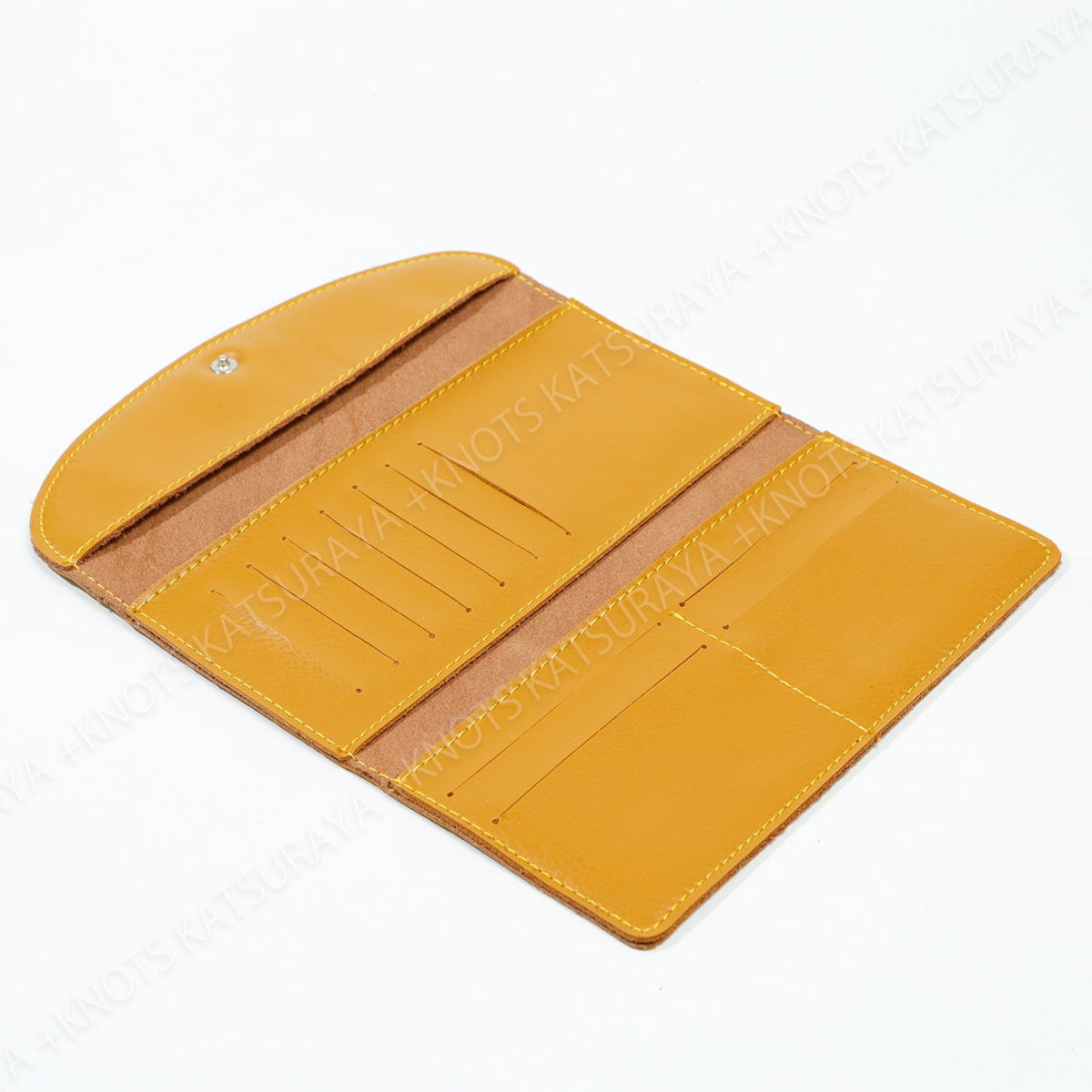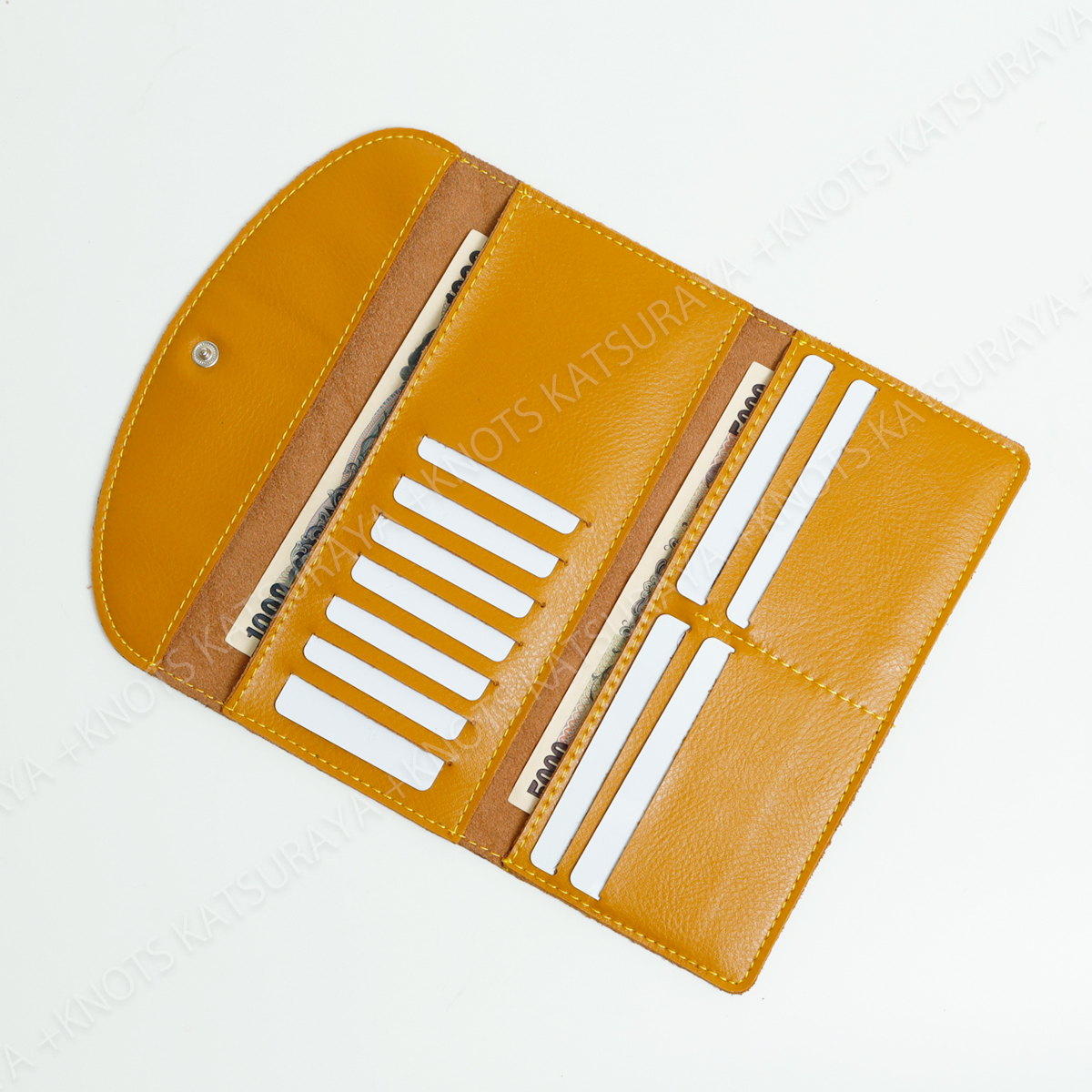 本革で作った、お札を折らずに収納できる薄型の三つ折り長財布です。カードケース11か所と札入れ2か所のシンプルな構造、小銭入れはありません。内部にも外側と同じ牛革を使用しています。レシートなどの仕分けにも便利です。