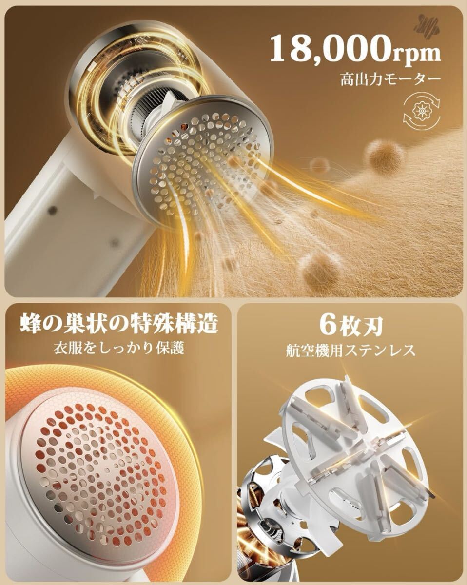 【プロも認めた切削性能】業界最高峰の6枚刃パワーで毛玉ストレス解消!航空宇宙技術にも採用される440C高炭素ステンレス製の40mm大型6枚刃が、どんなに頑固な毛玉も根元から完全吸引除去。けだまとり 電動の18,000rpmの超高出力モーター(日本電産製精密モーター)を搭載し、分厚いウールコート(約1.5kg)でもたった30秒で処理可能。実際の計測テストでは、市販品平均と比較して切削効率が2.3倍向上!