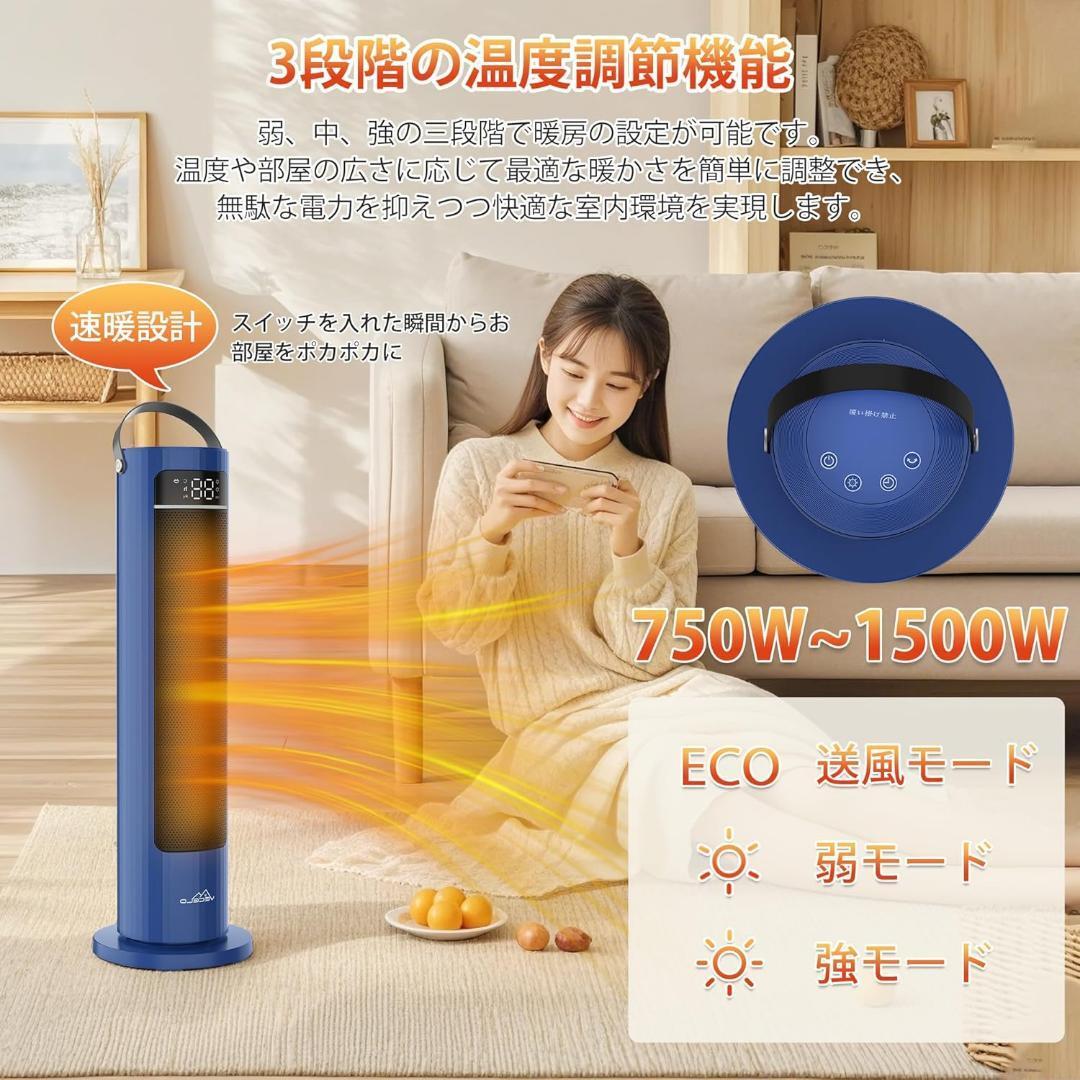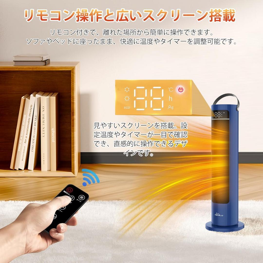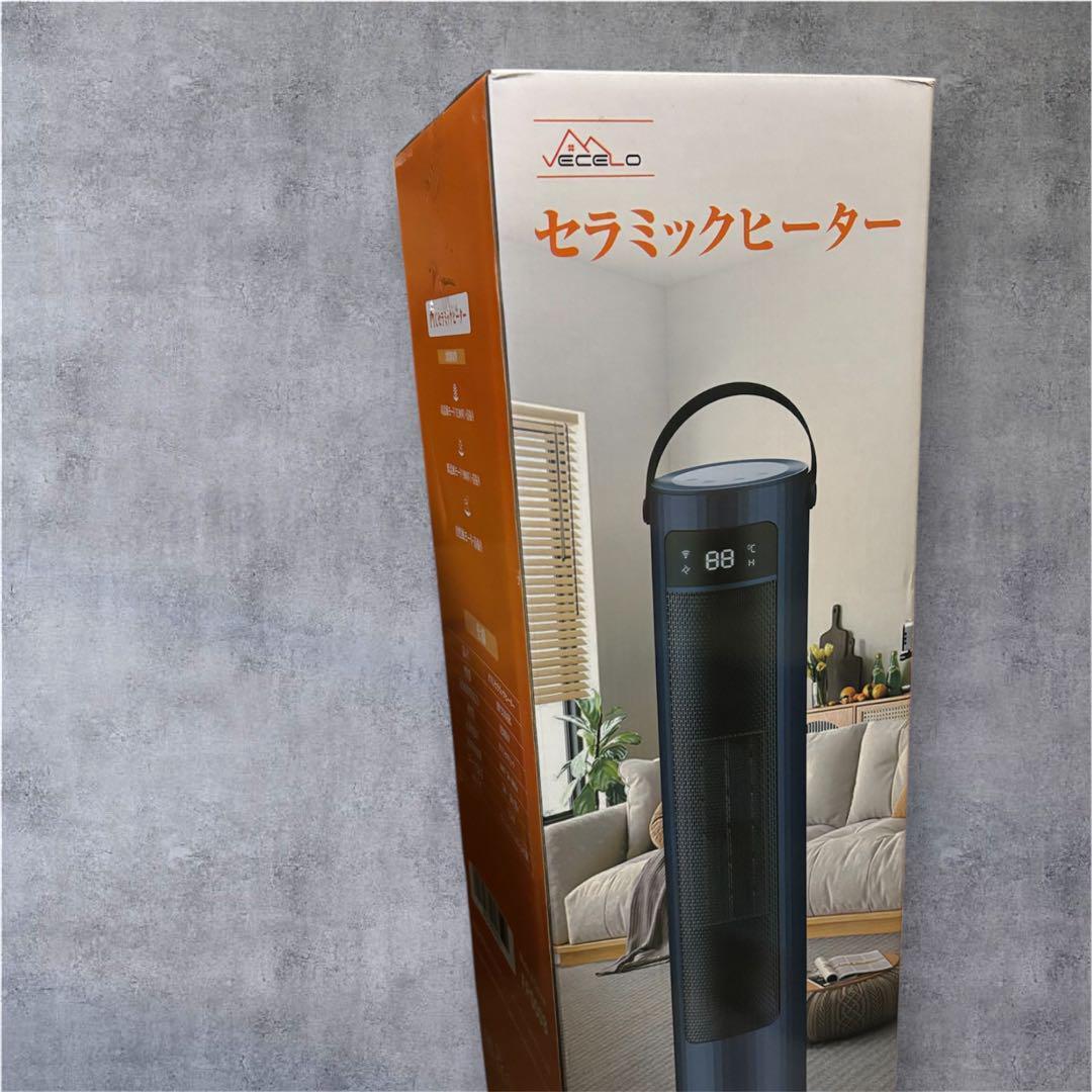 VECELO セラミックヒーター リモコン付き 電気ファンヒーター 3段階温度設定 タイマー機能 首振り 暖房器具 省エネ 750W/1500W 過熱保護 転倒安全装置 即暖 大風量 日本語説明書付 スリム オフィス 寝室 PSE適合品 幅19×奥行19×高さ60cm ブルー