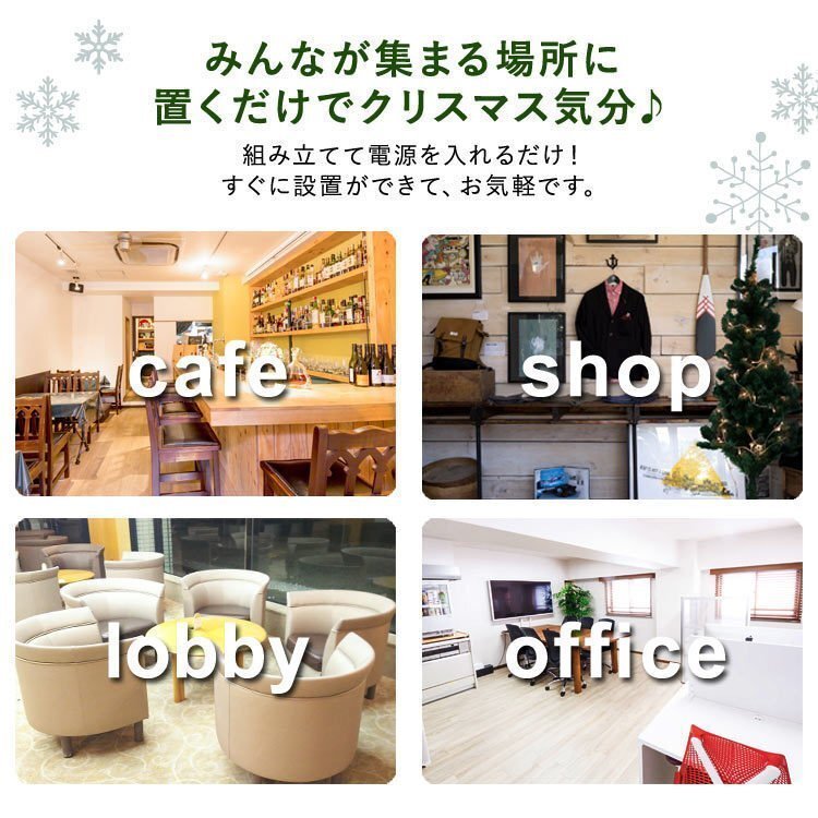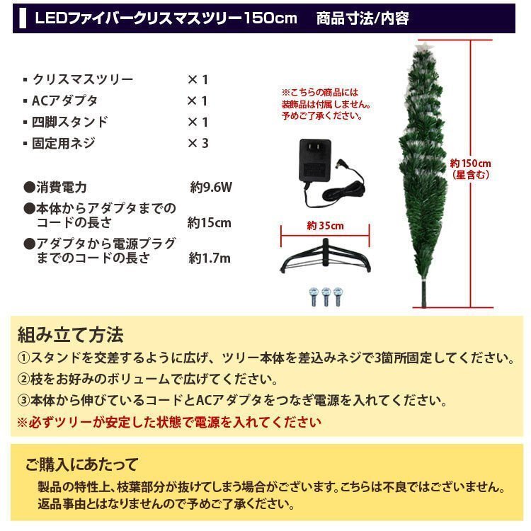 LEDライトなので、省電力。 ファイバーの光で様々な色の変化が楽しめます。 飾り付けをあまり派手にしなくても大丈夫! 届いて、コンセントをさすだけ! すぐ飾れて、収納時もラクラク♪ ファイバーの輝きで楽しいクリスマスをお過ごし下さい。 ■商品仕様 ツリーサイズ(約)高さ150cm、最大直径80cm 電源:専用ACアダプター 素材:PVC、スチール他 カラー:グリーン ※簡単な組立品です。 ※葉部分の形成不良箇所が多少なりともございます。また素材の性質上、香りが強く感じる場合がございます。製造上の都合となりますが、ご了承のうえご購入くださいませ。 ※飾りは付属しておりません。クリスマスツリー本体のみの価格となります。 |