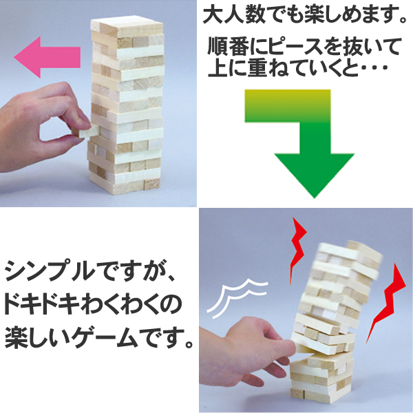 組み上げたブロックの木片を抜いて上へ積み上げていくゲームです。