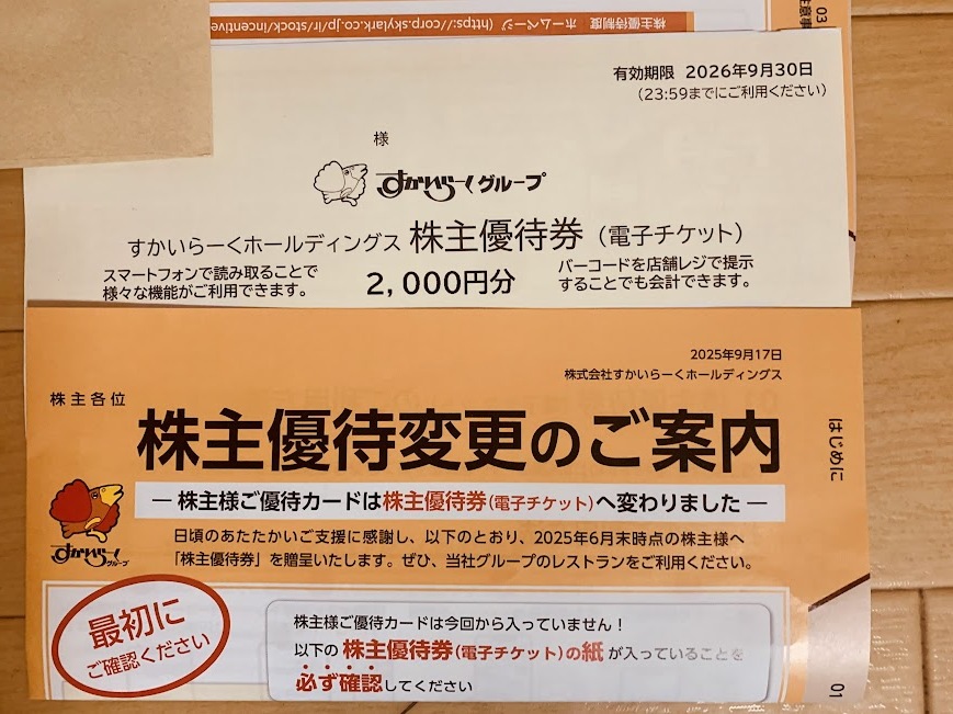 すかいらーく 株主優待券 2000円分 2026年9月30日 です。