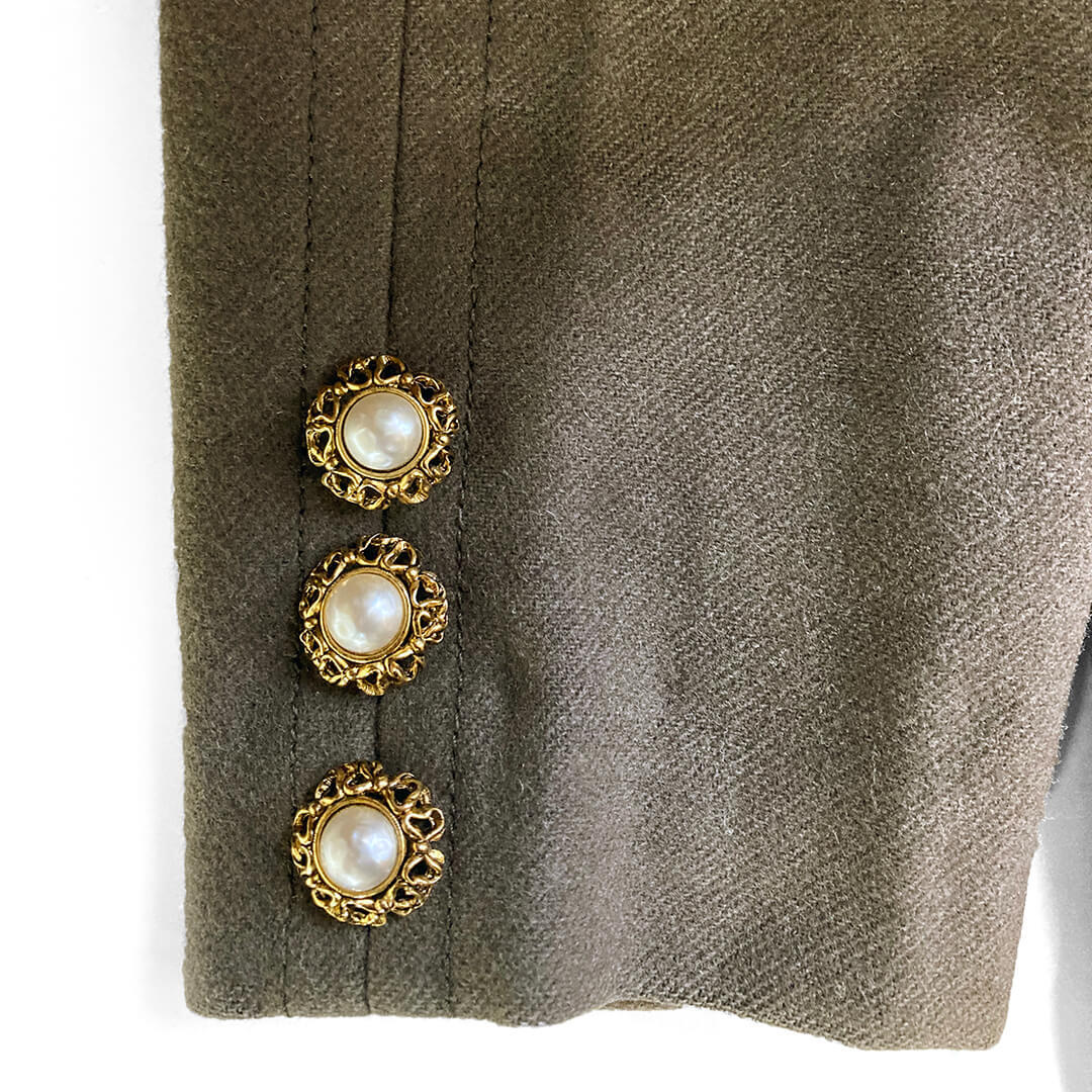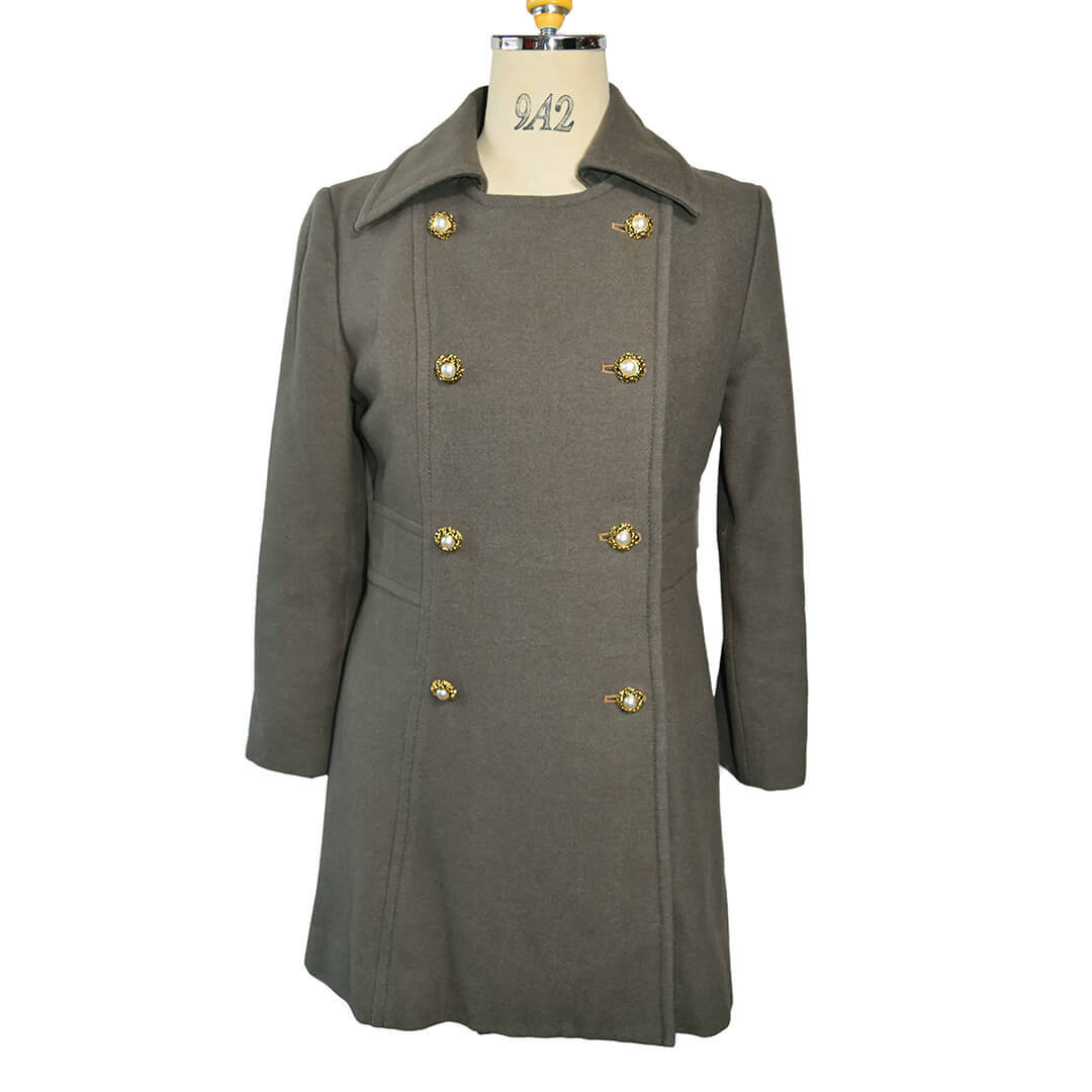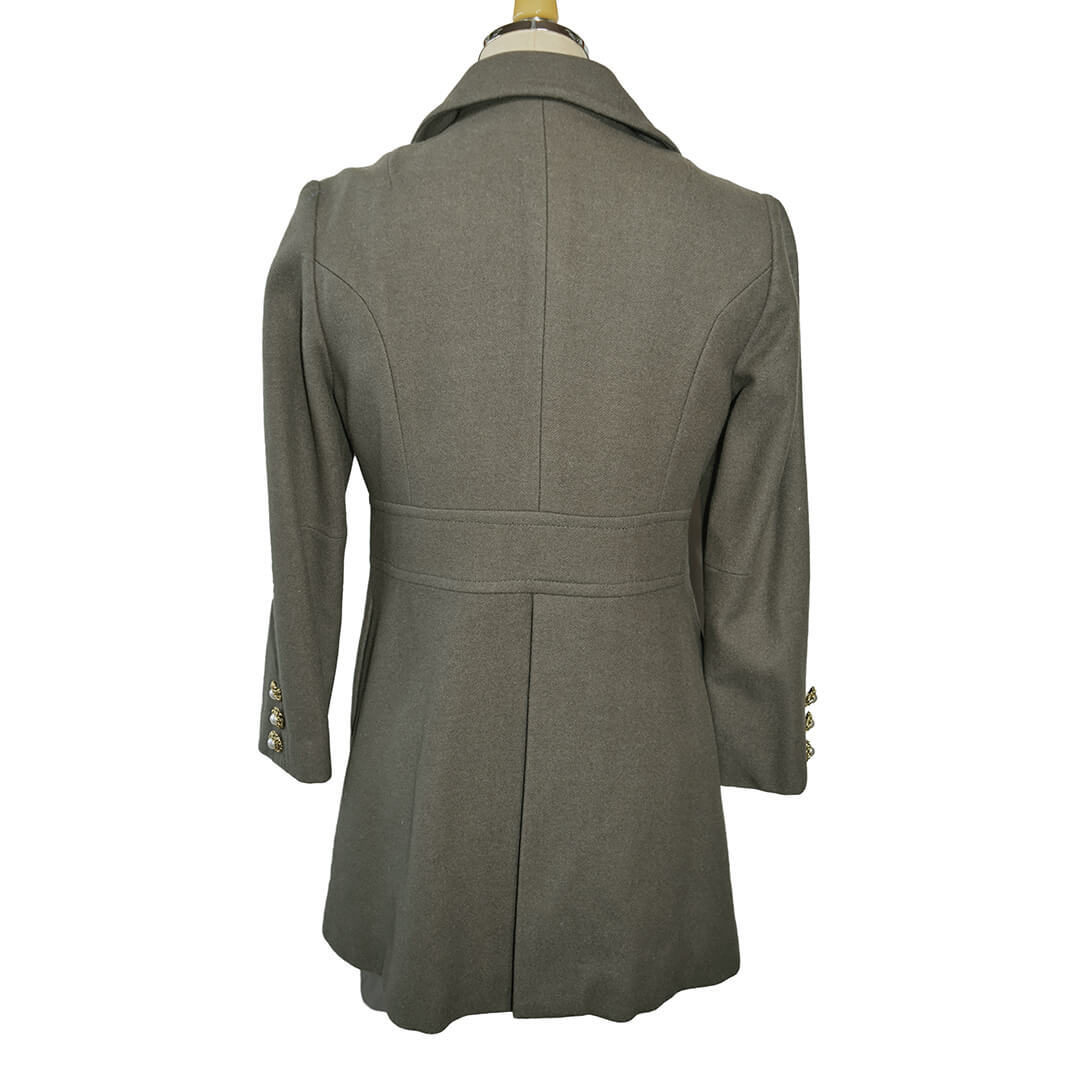 ウール100% の袖丈短め、厚手のコートで色はカーキ。学園祭などの衣装にもどうぞ。