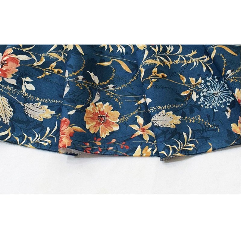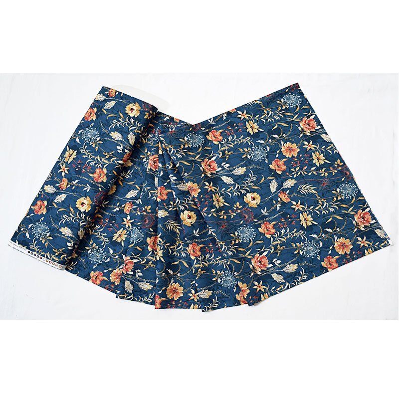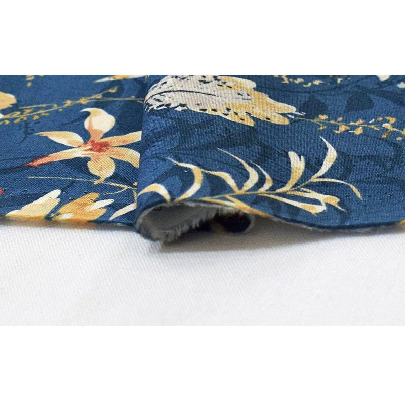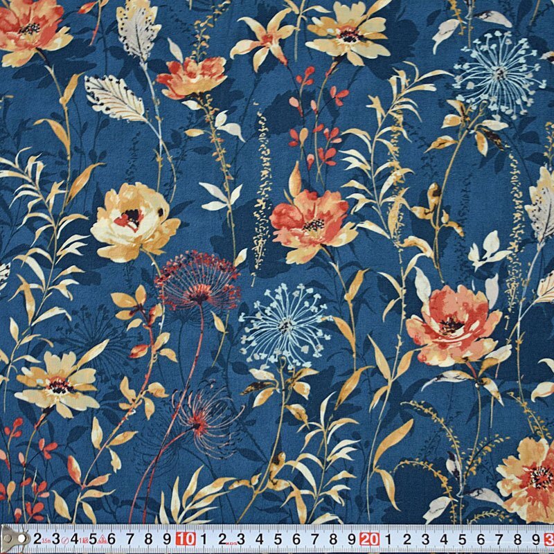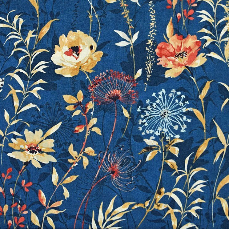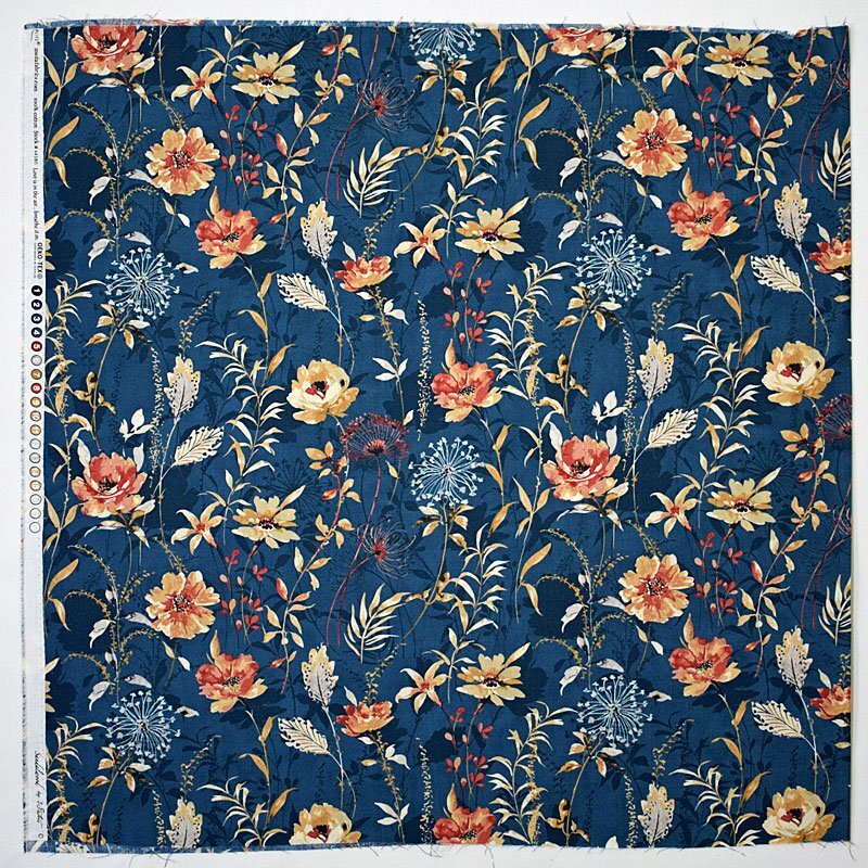 繊細に描かれたモチーフの草花がネイビー地から鮮やかに浮かび上がっています。