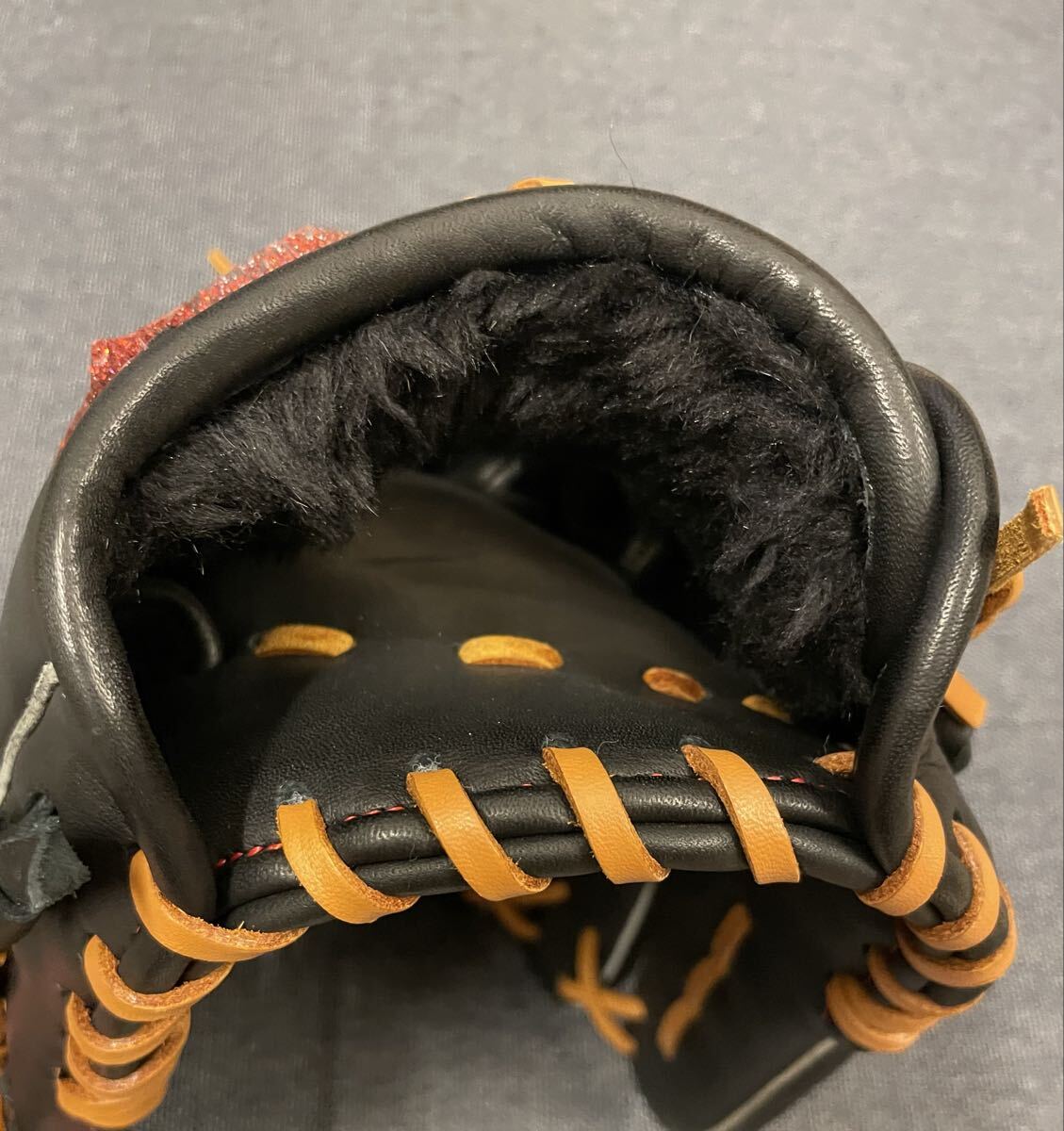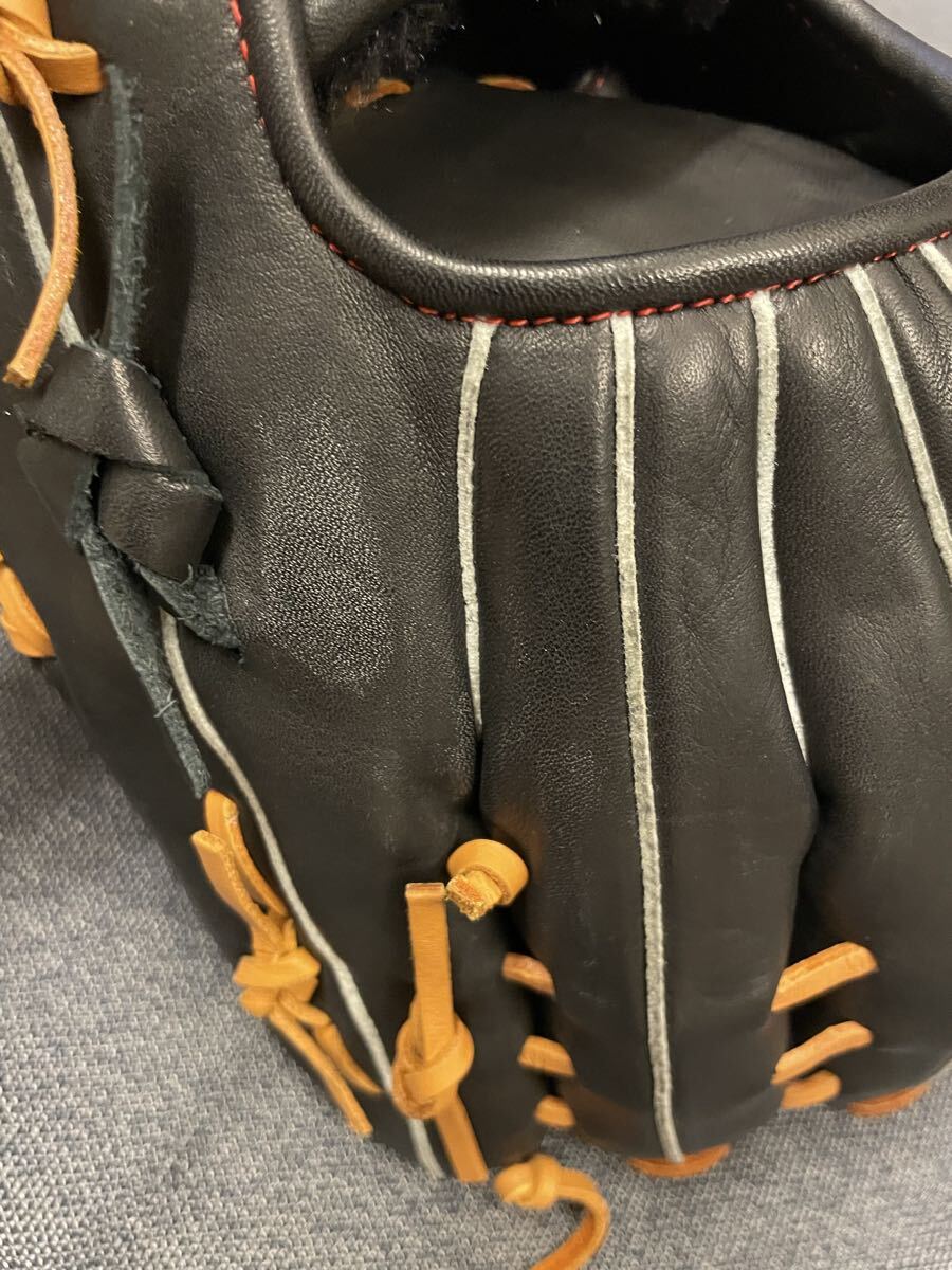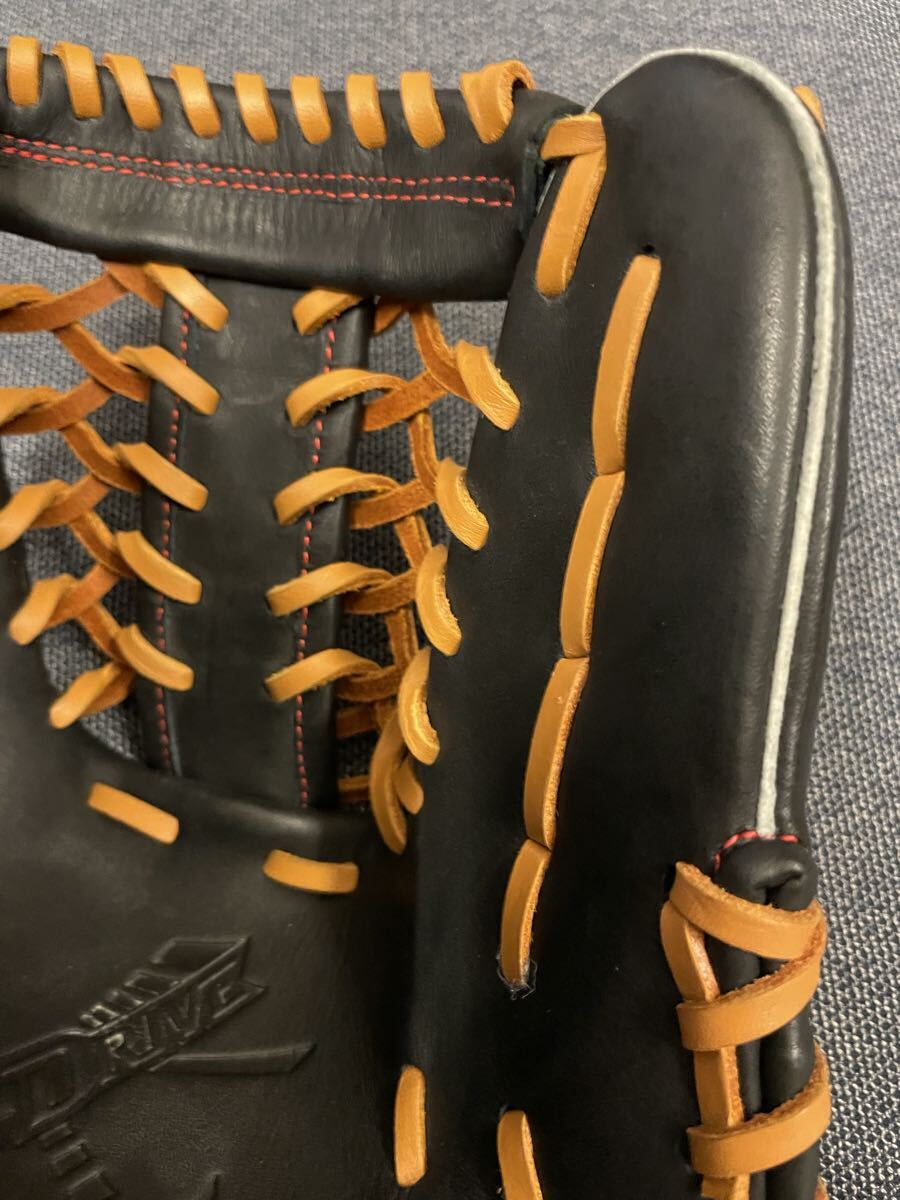 ■Droll構造:ボールの衝撃を受けやすいウェブ下部に補強紐を装着。ウェブ下親指指又部の革の破れを軽減。