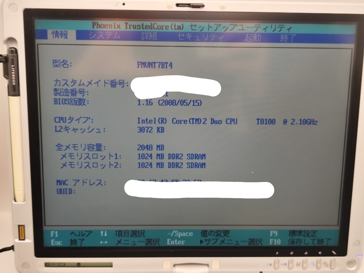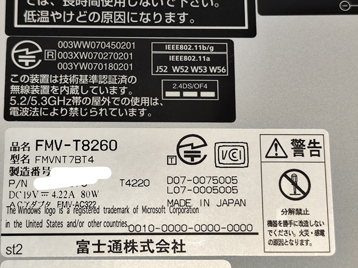 y1165 FUJITSU FMV-T8260 FMVNT7BT4 Core 2 Duo T8100 2GB ストレージ無 ジャンク