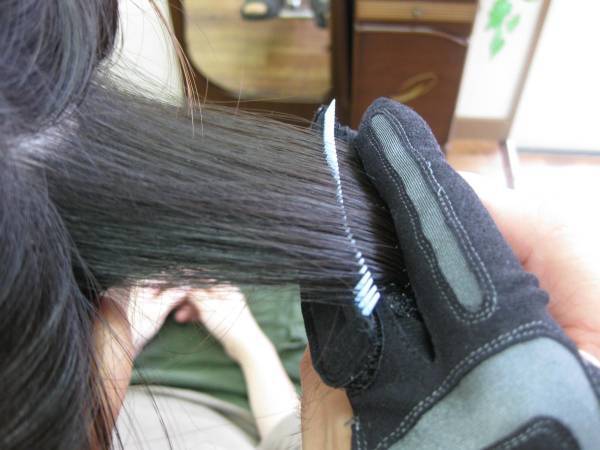 ストレートアイロン作業が簡単、綺麗、スピーディーに! コームとブラシが自分の指と一体化するので、テンションを自在にコントロールしながら、ダメージも少ない綺麗なストレートを可能にしました。まったく新しい発想から生まれたV-STRAIGHTグローブは ■指と一体化することで、アイロンを手に持ったまま作業ができます。道具を置いたりする時間が無いので、大幅にプロセスタイムが短縮されます! ■初心者では 習得が難しいアイロン操作も簡単に習得できます! ■髪を引っ張るテンシ ョンは指を握る力で自在にコントロールできます! ■アイロンをかけて熱 くて触れなかった髪も、ほのかに温度を確認しながら触ることができます! ■ブラシやコームでは 扱いにくかった短い髪も、しっかり掴むことができます! ■左手て一本で簡単に髪をとかしこめます! ■髪をつかんで梳かしながら、自由な方向に誘導できるので、ストレートアイロンでのセットも綺麗で 簡単にニュアンス付けが可能! プロの美容師様や理容師様、アシスタント様や一般の方まで、幅広くご使用して頂けます。 一度使い慣れてしまうと手放せなくなってしまう一品です! |
