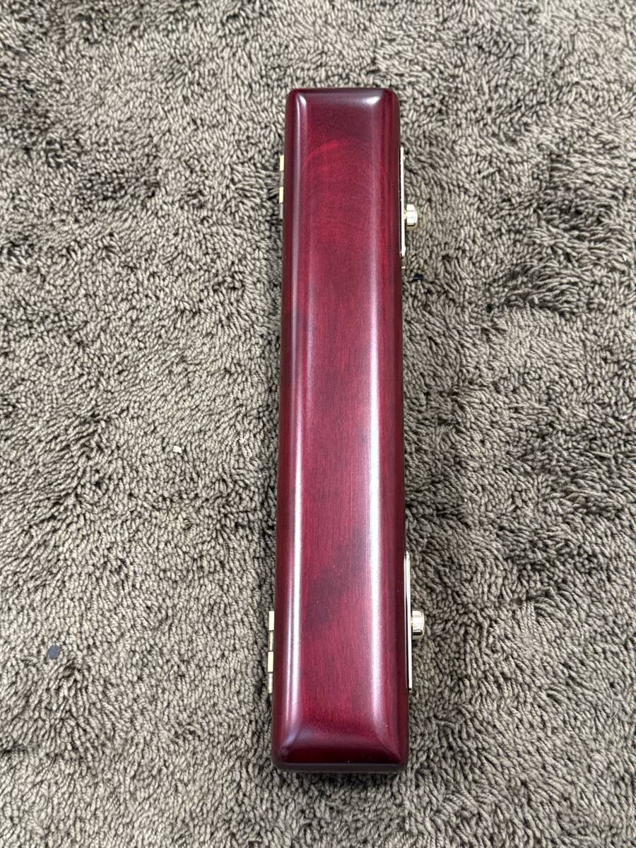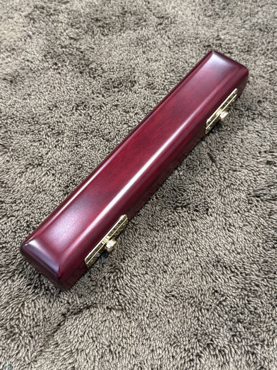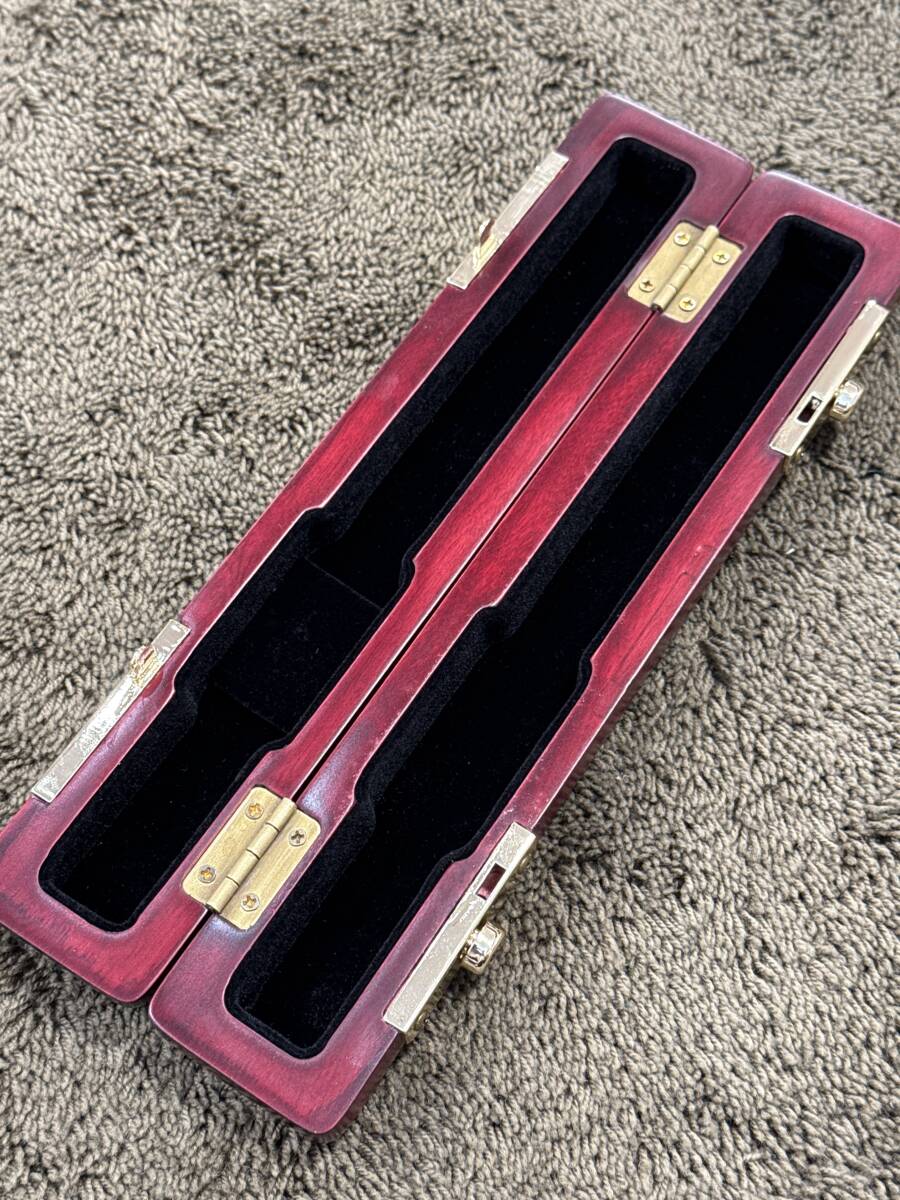 天然木製フルート頭部管ケース1本収納タイプです。色はマホガニー色です。木製製品ですのでご理解の上お願い致します。外寸横25センチx縦3.5センチx奥行5.5センチ(金具含む)内寸横22.8センチx縦2.8センチx奥行2.5センチ(リップ部分)奥行1.8センチ(胴管部分)宜しくお願い致します。