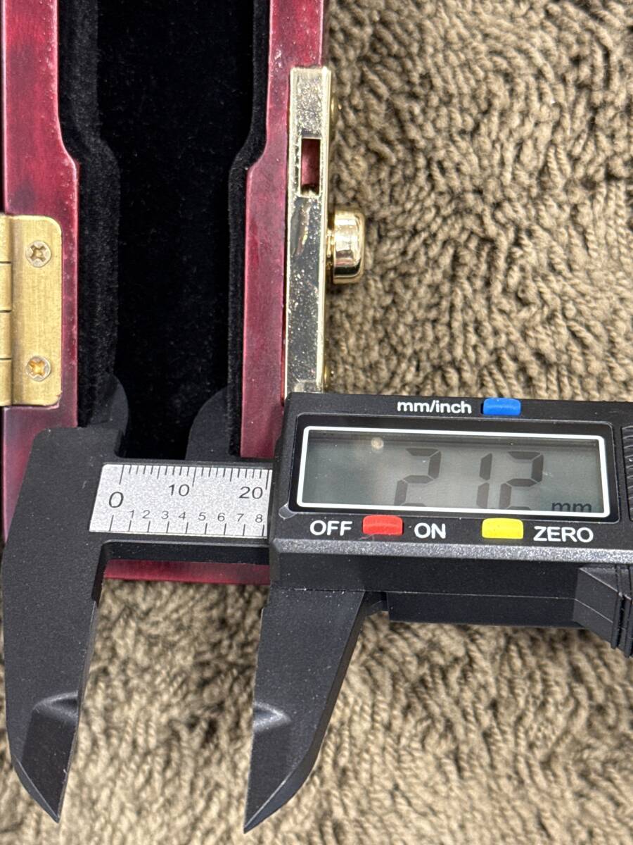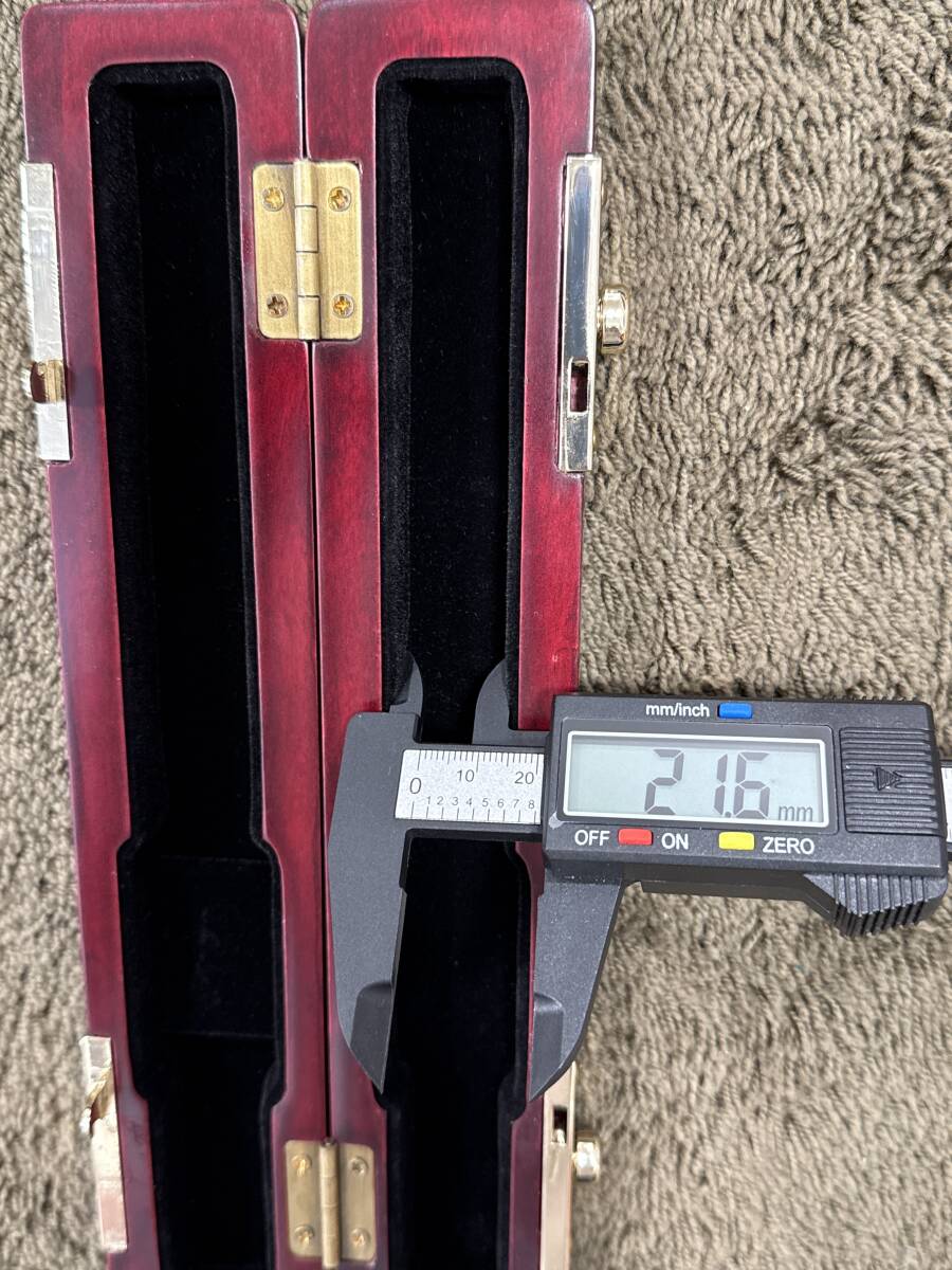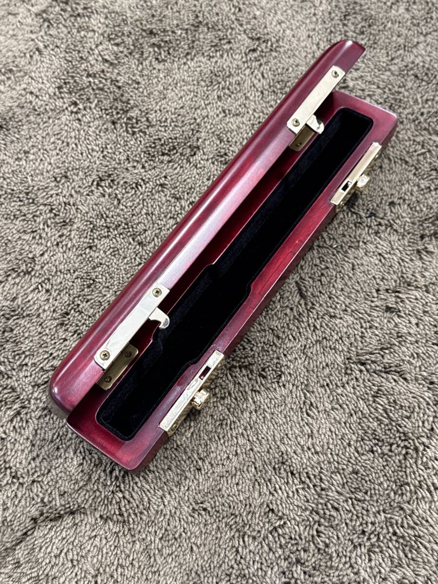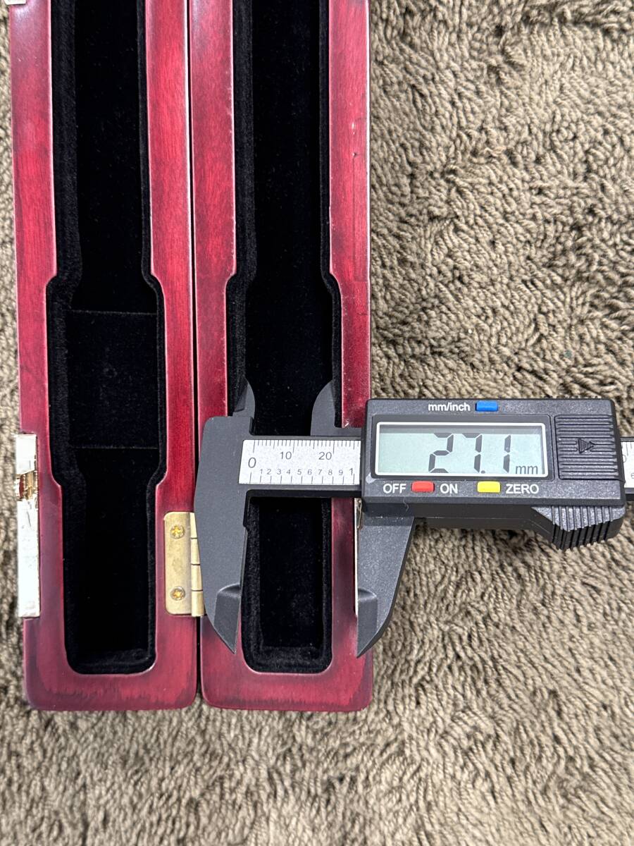 天然木製フルート頭部管ケース1本収納タイプです。色はマホガニー色です。木製製品ですのでご理解の上お願い致します。外寸横25センチx縦3.5センチx奥行5.5センチ(金具含む)内寸横22.8センチx縦2.8センチx奥行2.5センチ(リップ部分)奥行1.8センチ(胴管部分)宜しくお願い致します。