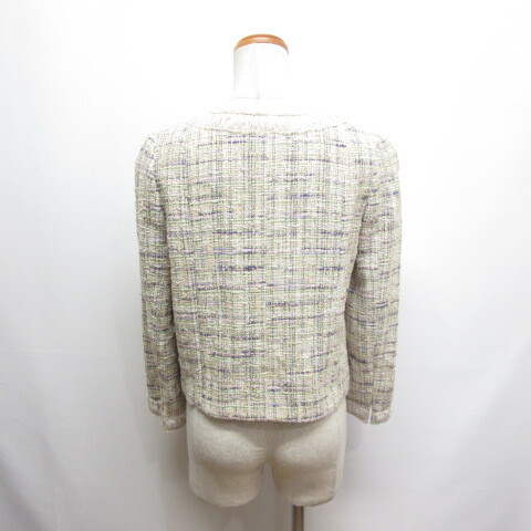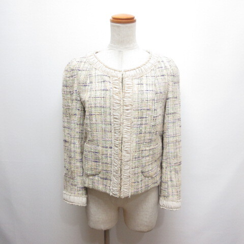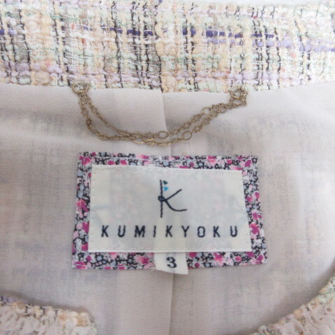 クミキョク 組曲 KUMIKYOKU ツイード チェック ノーカラー ジャケット 3 アイボリー シフォンフリル装飾 ホックボタン 裏地付き レディース